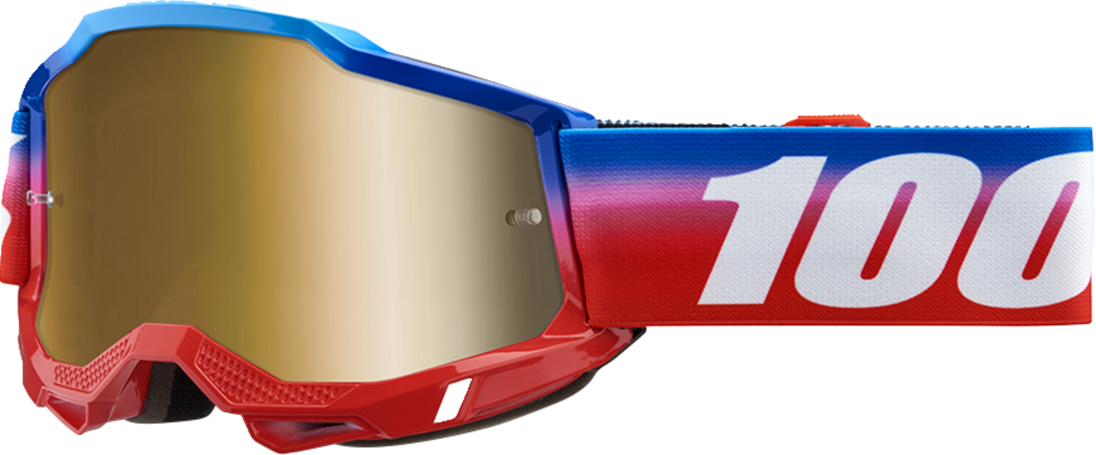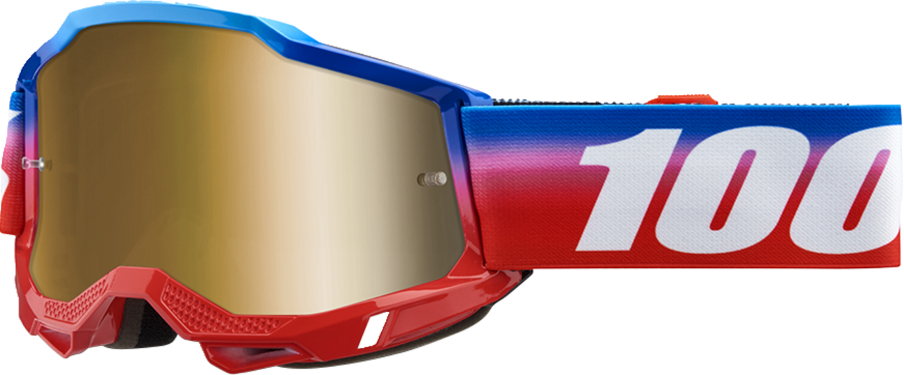Accuri 2 Goggles - Unity - True Gold Mirror Accuri 2 Goggles — Mirrored Lens Improved fitment and seal with increased field of view Ultra-thick triple layer face foam soaks up sweat Supports triple post tear-offs for secure fitment Slash logo embellishment detail 9-point lens retention system secures lens in frame 45 mm wide silicone coated strap for maximum grip Anti-fog coated polycarbonate lens for clear vision