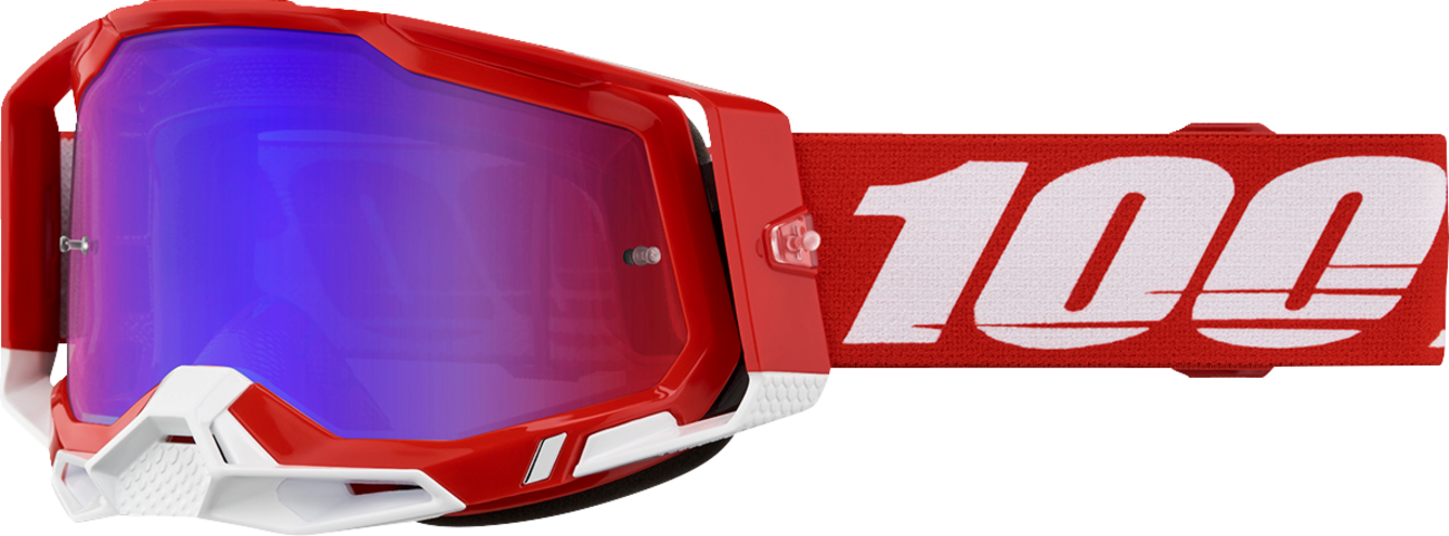 Racecraft 2 Goggle - Red - Red Blue Mirror Racecraft 2 Goggle Dual injected, wide outriggers for a balanced fit Improved fitment and seal with increased field of view 9-point lens retention system secures lens in frame Supports triple post tear-offs for secure fitment 45 mm wide silicone coated strap for maximum grip Ultra-thick triple layer face foam soaks up sweat Anti-fog coated polycarbonate lens for clear vision Pure molding eliminates sewing for a seamless strap Slash logo embellishment detail Removable nose guard deflects roost and debris