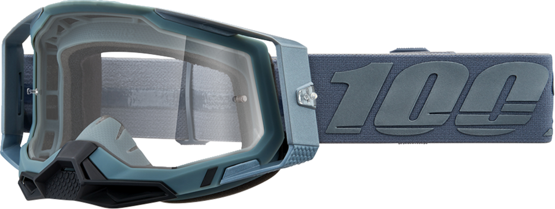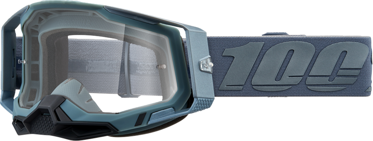 Racecraft 2 Goggles - Battleship - Clear Racecraft 2 Goggles — Clear Lens Dual injected, wide outriggers for a balanced fit Improved fitment and seal with increased field of view Supports triple post tear-offs for secure fitment 9-point lens retention system secures lens in frame Ultra-thick triple layer face foam soaks up sweat 45 mm wide silicone coated strap for maximum grip Slash logo embellishment detail Anti-fog coated polycarbonate lens for clear vision Removable nose guard deflects roost and debris Pure molding eliminates sewing for a seamless strap