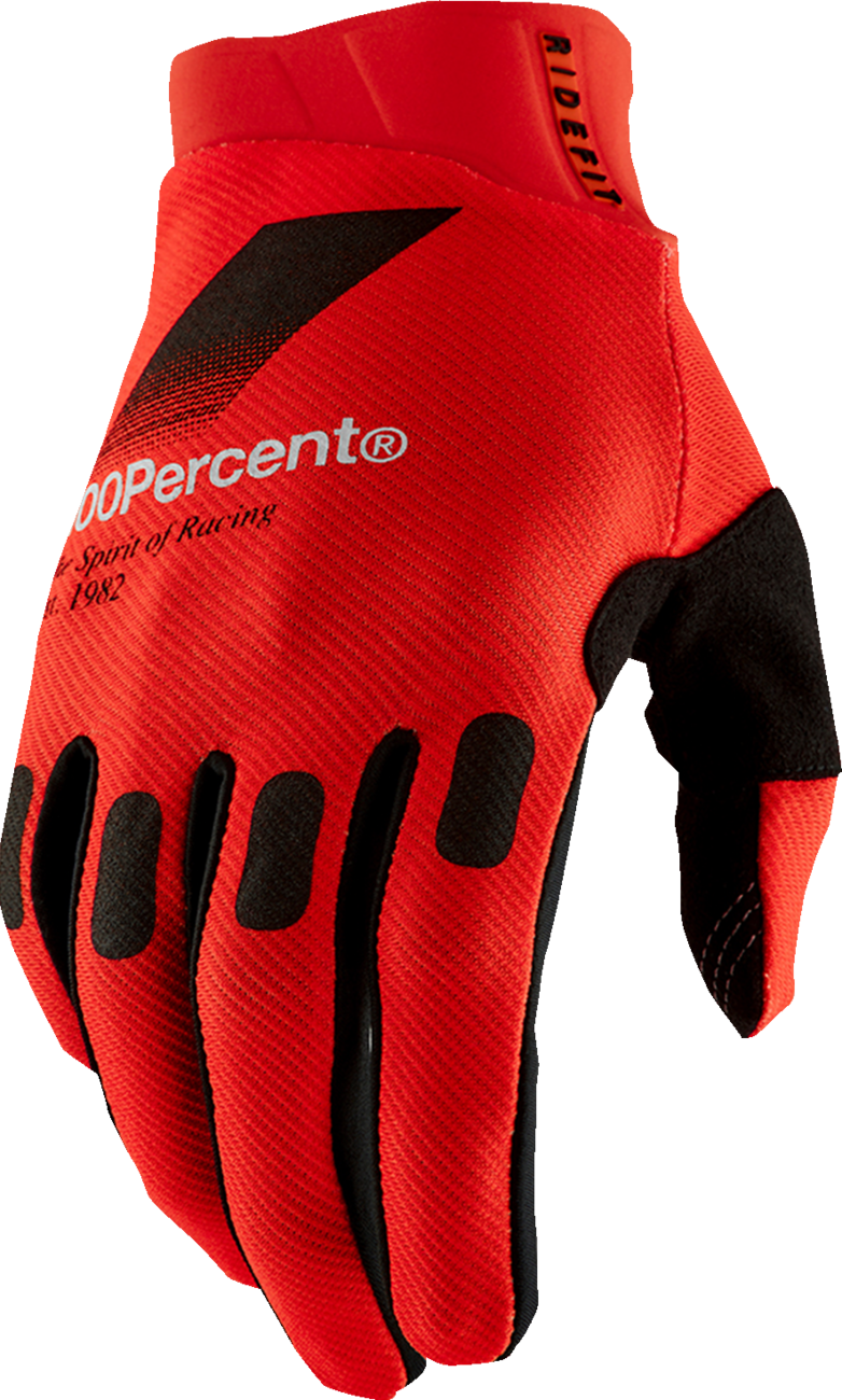 Ridefit Gloves - Red - Medium Ridefit Gloves Embossed neoprene cuff offers durability and comfort Stretch finger gussets enhance mobility and wick away moisture Thumb overlay helps reduce blisters Perforated single-layer Clarino® palm improves comfort and reduces bunching Silicone palm graphics complete the factory look and provides added grip Integrated tech-thread keeps you connected with your devices