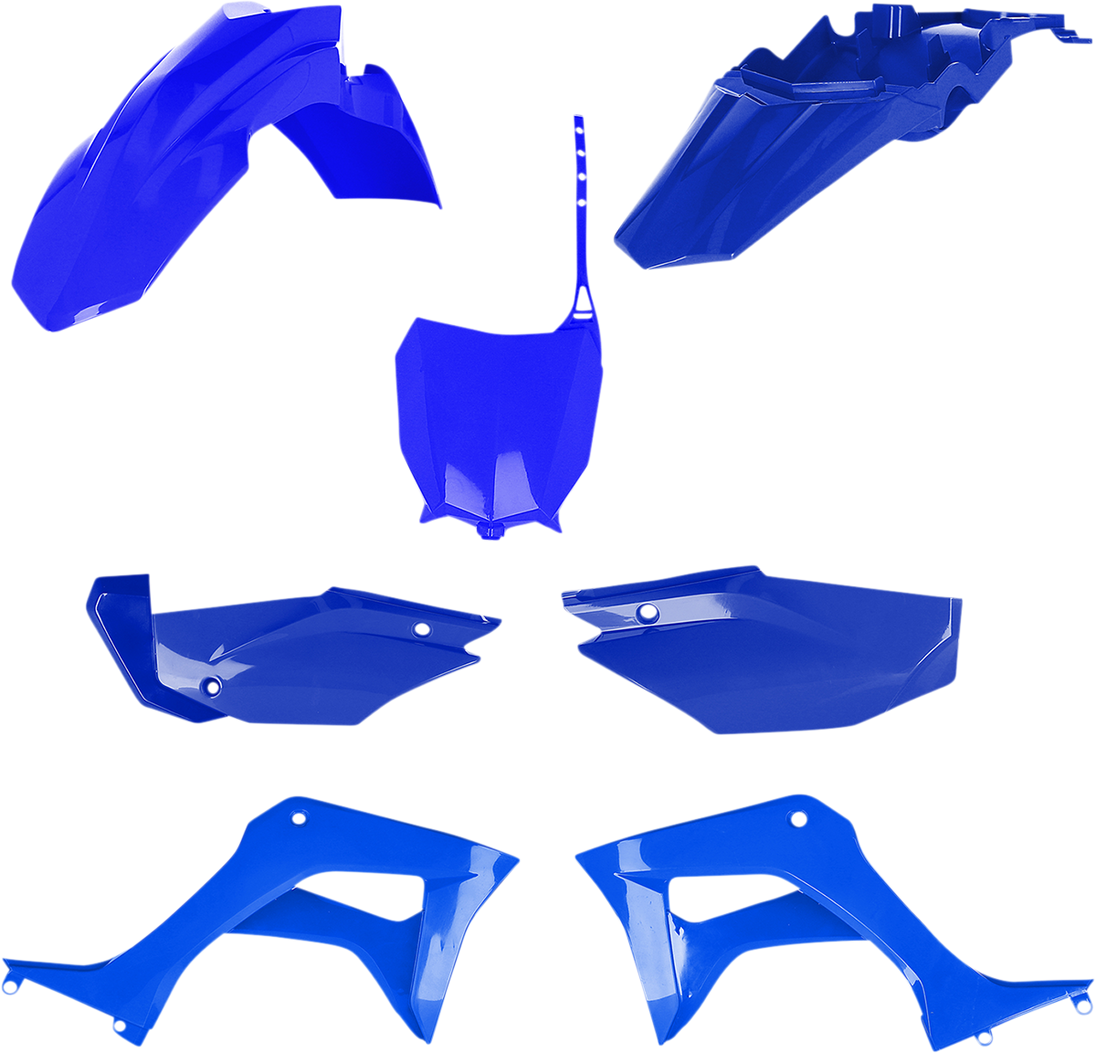 Full Replacement Body Kit - Blue Replacement Plastic Kit OEM color-matched for direct replacement or works look Pre-drilled pieces mount easily to stock locations Standard kit includes front fender, rear fender, side panels and radiator shrouds Full kit includes front fender, front number plate, lower fork cover set, radiator shrouds, side panels, and rear fender Made in Italy