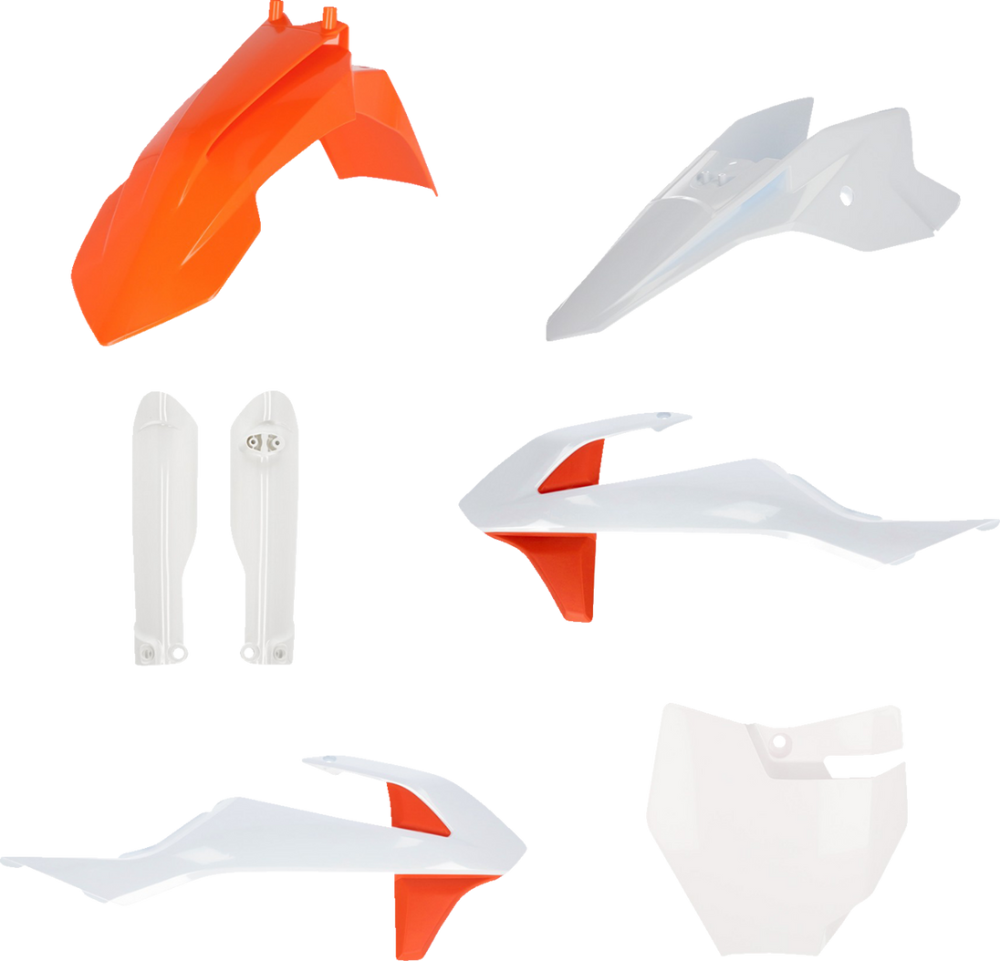 Full Replacement Body Kit - OEM '19 Orange/White Replacement Plastic Kit OEM color-matched for direct replacement or works look Pre-drilled pieces mount easily to stock locations Standard kit includes front fender, rear fender, side panels and radiator shrouds Full kit includes front fender, front number plate, lower fork cover set, radiator shrouds, side panels, and rear fender Made in Italy