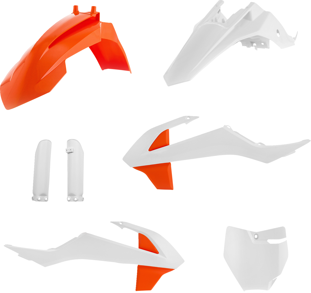 Full Replacement Body Kit - OEM '23 White/Orange Replacement Plastic Kit OEM color-matched for direct replacement or works look Pre-drilled pieces mount easily to stock locations Standard kit includes front fender, rear fender, side panels and radiator shrouds Full kit includes front fender, front number plate, lower fork cover set, radiator shrouds, side panels, and rear fender Made in Italy