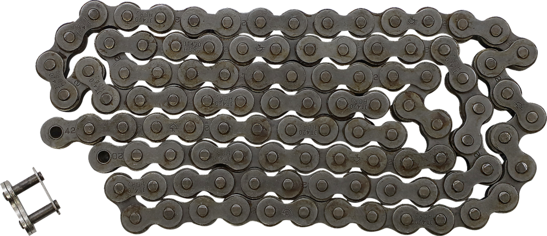 420 HDR - Heavy Duty Drive Chain - Steel - 104 Links 420 HDR Heavy Duty Drive Chain JT Chains produces a full range of superior quality motorcycle chains using leading-edge technology and only the highest grade of special steel alloys Specifications of the JT advanced power transfer chains meet or exceed the requirements of all modern motorcycles, street, MX, enduro, offroad and ATV A full range of chain types, from 50cc mopeds to 200+ bhp superbikes, in steel or gold finish Leading edge technology in materials and production ensures top class performance, strength and durability Specially engineered to favorably compare with all types and brands of motorcycle chain on the market