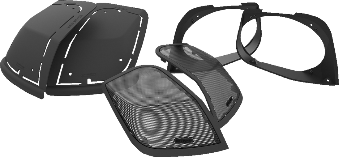 Cut In Lid Kit Cut In Lid Kit for 6"x9" Speakers Well thought out design radically reduces standing water on speakers when parked Easily add 6"x9” speakers to your lids without need for paint Properly designed kit has speakers pointing towards the rider for optimal sound More of the speaker is exposed than current offerings ensuring maximum sound potential Sleek design follows lines of bike much better than current offerings 1mm thick “boot worthy” grill mesh Supplied template makes cutting lids much easier than current offerings. Upgraded wire harness covered in “Nyla braid” with custom inline grommet for bags Includes adapters with grills, cutting templates, wiring, and all required hardware to complete the installation Fitment: