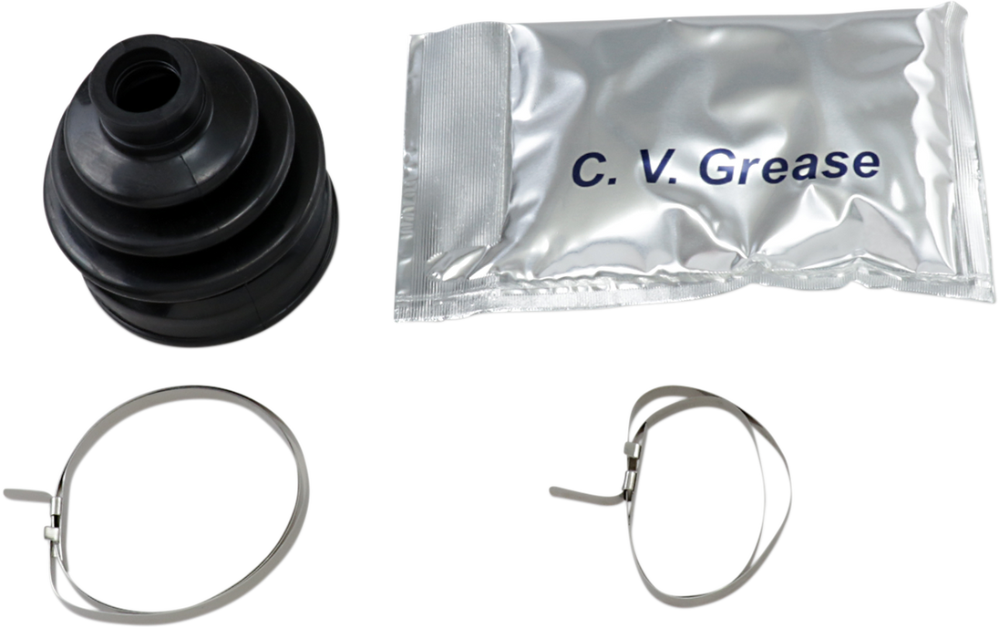 CV Boot Kit - Front/Rear Inner/Outer CV Boot Kit 40% higher tensile strength and 50% more abrasion resistant than conventional material, suitable for the high joint angles and demands of today's ATVs and UTVs Kits include two stainless steel clamps that are designed to be tightened without the use of special tools Lithium-based molybdenum grease ensures good lubrication for long CV joint life Fitment: