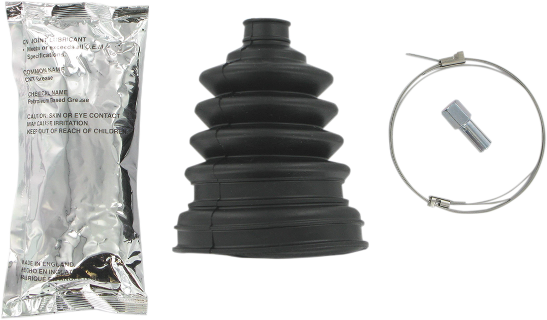 CV Boot Kit - Front/Rear Outboard CV Boot Kit Standard — CV Boot Includes (MOs2) Molybdenum disulfide grease packs for longer life under high stress loads that are seen in CV Joint and axle applications Super Tough Polychloroprene material withstands heat, cold and abuse Includes 1 cv boot, clamps and grease Fitment: