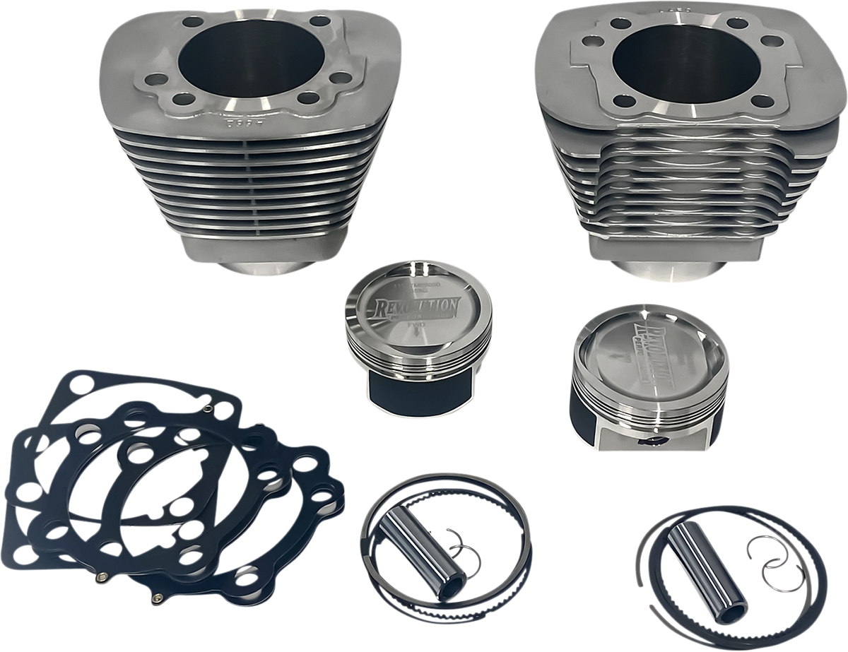 Cylinder Kit - 1250 cc - Natural Cylinder Kit Aerospace-grade all-aluminum cylinder with nickel-silicon-carbide (NSC) electroplated bore No sleeving allows for larger bore sizes NSC-plated cylinders have less friction for increased horsepower, lower engine temperatures and a longer lifespan Monster big bore kits will require case boring Includes pair of all-aluminum NSC-coated bore cylinders, custom-forged pistons with high-tension rings specifically designed for NSC cylinders and a head/base gasket set Replacement gasket sets available separately Upgraded cylinders studs and head bolts recommended Made in the USA Fitment: