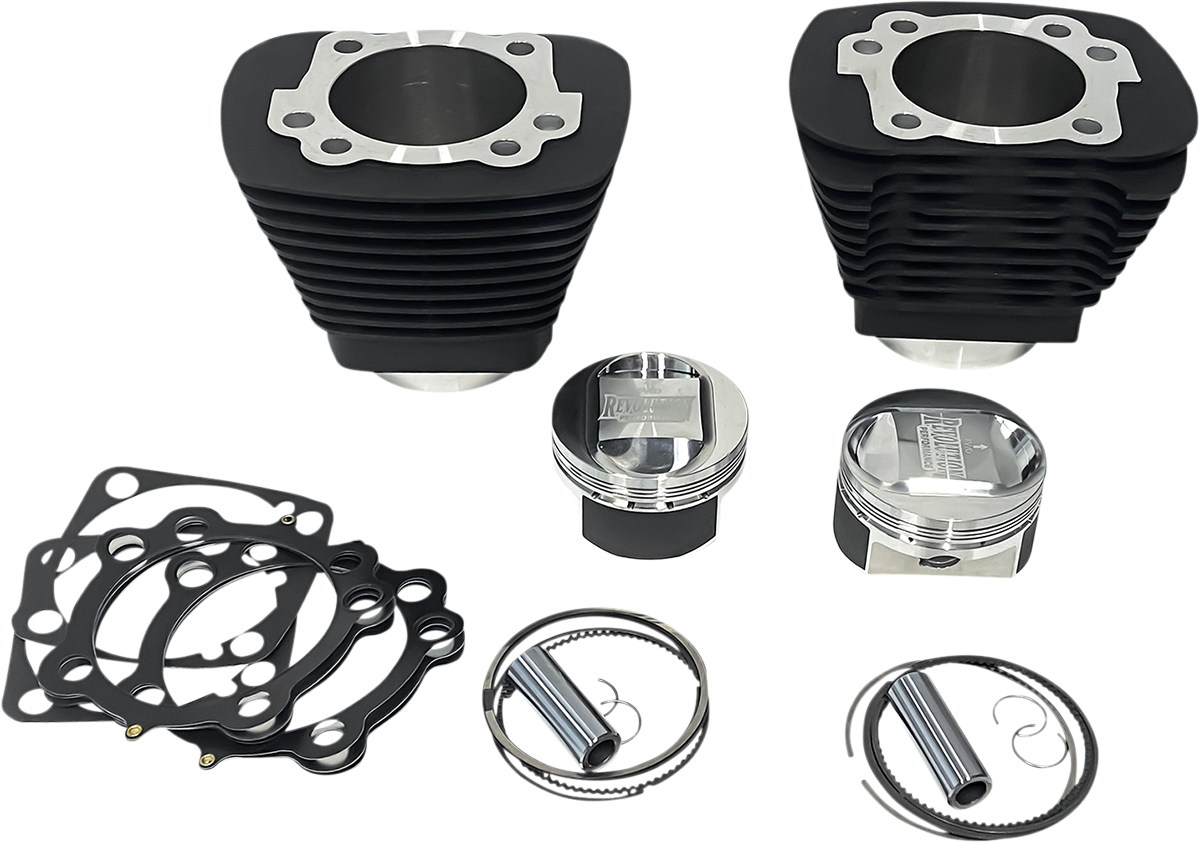 Cylinder Kit - 1250 cc - Black Cylinder Kit Aerospace-grade all-aluminum cylinder with nickel-silicon-carbide (NSC) electroplated bore No sleeving allows for larger bore sizes NSC-plated cylinders have less friction for increased horsepower, lower engine temperatures and a longer lifespan Monster big bore kits will require case boring Includes pair of all-aluminum NSC-coated bore cylinders, custom-forged pistons with high-tension rings specifically designed for NSC cylinders and a head/base gasket set Replacement gasket sets available separately Upgraded cylinders studs and head bolts recommended Made in the USA Fitment: