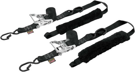 Deluxe Ratchet Tie-Downs - 1-1/2" x 6-1/2' - Black 1-1/2" Fat Strap Deluxe Tie-Downs 1-1/2" (EU: 3,81 cm) wide Chromacoat ratchet Vinyl-coated with safety latch hooks Sewn-in sheepskin Soft-Tye 6,000-lb. (EU: 2721,55 kg) test nylon webbing;...Regular price $61.95 -