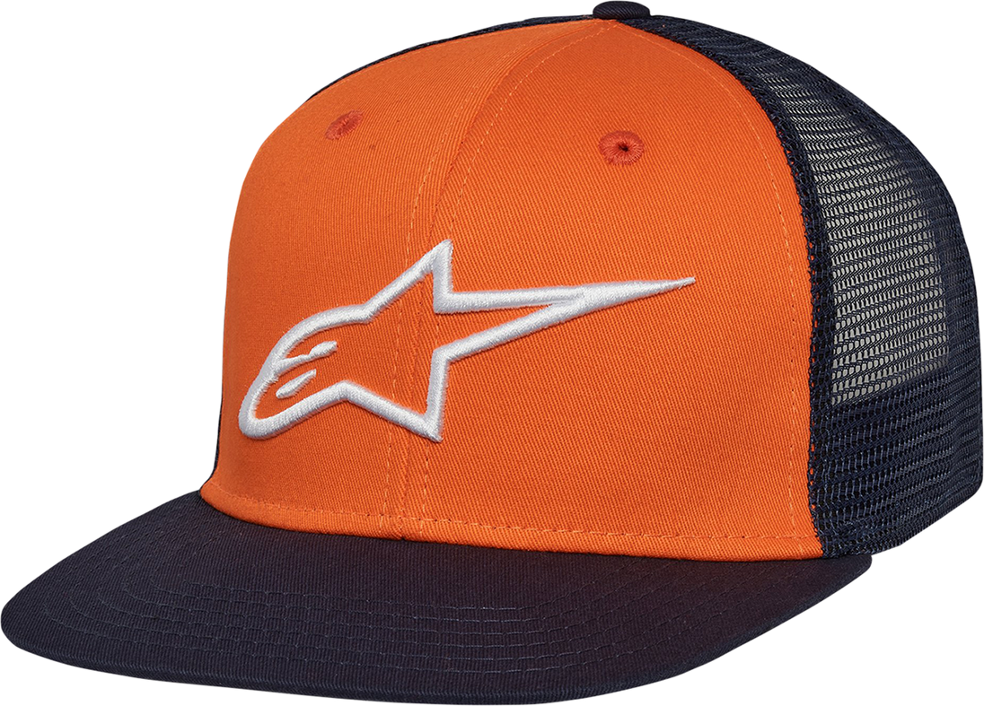 Corp Trucker Hat - Orange/Navy - One Size Corp Trucker Hat Special Instructions: WRNG PIC 23 ASTARS CASUAL02JBC WRNG PIC 23 ASTARS CASUAL€ƒ02JBC Structured crown and snap back hat Twill main front, mesh back fabric Flat embroidered logo Internal and back labeling 60% Cotton / 40% Polyester