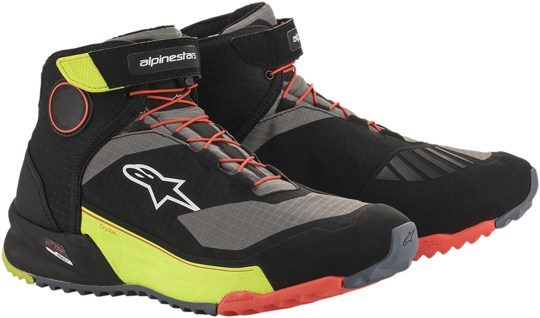 CR-X Drystar® Shoes - Black/Red/Yellow Fluorescent - US 12 CR-X Drystar® Riding Shoes Drystar® membrane offers effective weather protection in wet conditions The sole unit ‘DROP’ (or, the off-set between heel and toe) is set at 9 mm (many running shoes have a 9 mm drop) to ensure a smooth heel-to-toe transition when walking Features an EVA midsole provides for excellent all-day underfoot comfort Forefoot Flex grooves are engineered into the midsole for enhanced forefoot comfort (the grooves promote flexing in the forefoot area) Full-length TPU inner sole plate for superior riding protection and a dynamic heel-to-toe transition when walking Asymmetric outsole stud configuration provides excellent levels of grip and abrasion resistance Oil resistant dual rubber compound provides optimized grip on unclean/slippery surfaces Removable Ortholite insock provides long lasting comfort and prevents over heating thanks to the Open Cell PU compound Hidden asymmetric lateral and medial TPU ankle discs for effective but discreet ankle protection Lightweight inner bootie with minimal construction design for a comfortable, glove-like fit Tongue with bellows construction has been designed to remain in position when riding for a snug, secure fit Gear shift zone features a highly abrasive-resistant TPU layer for enhanced durability Internal EVA layer sandwiched between outer and inner materials reduces pressure on the foot in the gear shift area, thus ensuring superior rider comfort