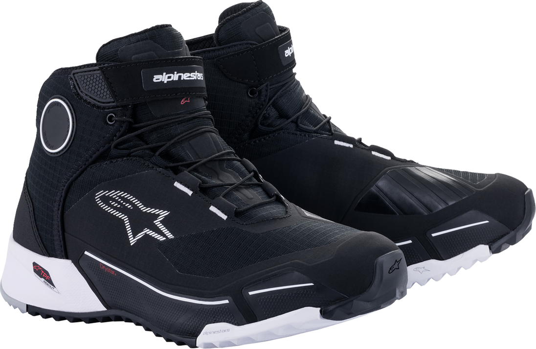 CR-X Drystar® Shoes - Black/White - US 14 CR-X Drystar® Riding Shoes Drystar® membrane offers effective weather protection in wet conditions The sole unit ‘DROP’ (or, the off-set between heel and toe) is set at 9 mm (many running shoes have a 9 mm drop) to ensure a smooth heel-to-toe transition when walking Features an EVA midsole provides for excellent all-day underfoot comfort Forefoot Flex grooves are engineered into the midsole for enhanced forefoot comfort (the grooves promote flexing in the forefoot area) Full-length TPU inner sole plate for superior riding protection and a dynamic heel-to-toe transition when walking Asymmetric outsole stud configuration provides excellent levels of grip and abrasion resistance Oil resistant dual rubber compound provides optimized grip on unclean/slippery surfaces Removable Ortholite insock provides long lasting comfort and prevents over heating thanks to the Open Cell PU compound Hidden asymmetric lateral and medial TPU ankle discs for effective but discreet ankle protection Lightweight inner bootie with minimal construction design for a comfortable, glove-like fit Tongue with bellows construction has been designed to remain in position when riding for a snug, secure fit Gear shift zone features a highly abrasive-resistant TPU layer for enhanced durability Internal EVA layer sandwiched between outer and inner materials reduces pressure on the foot in the gear shift area, thus ensuring superior rider comfort