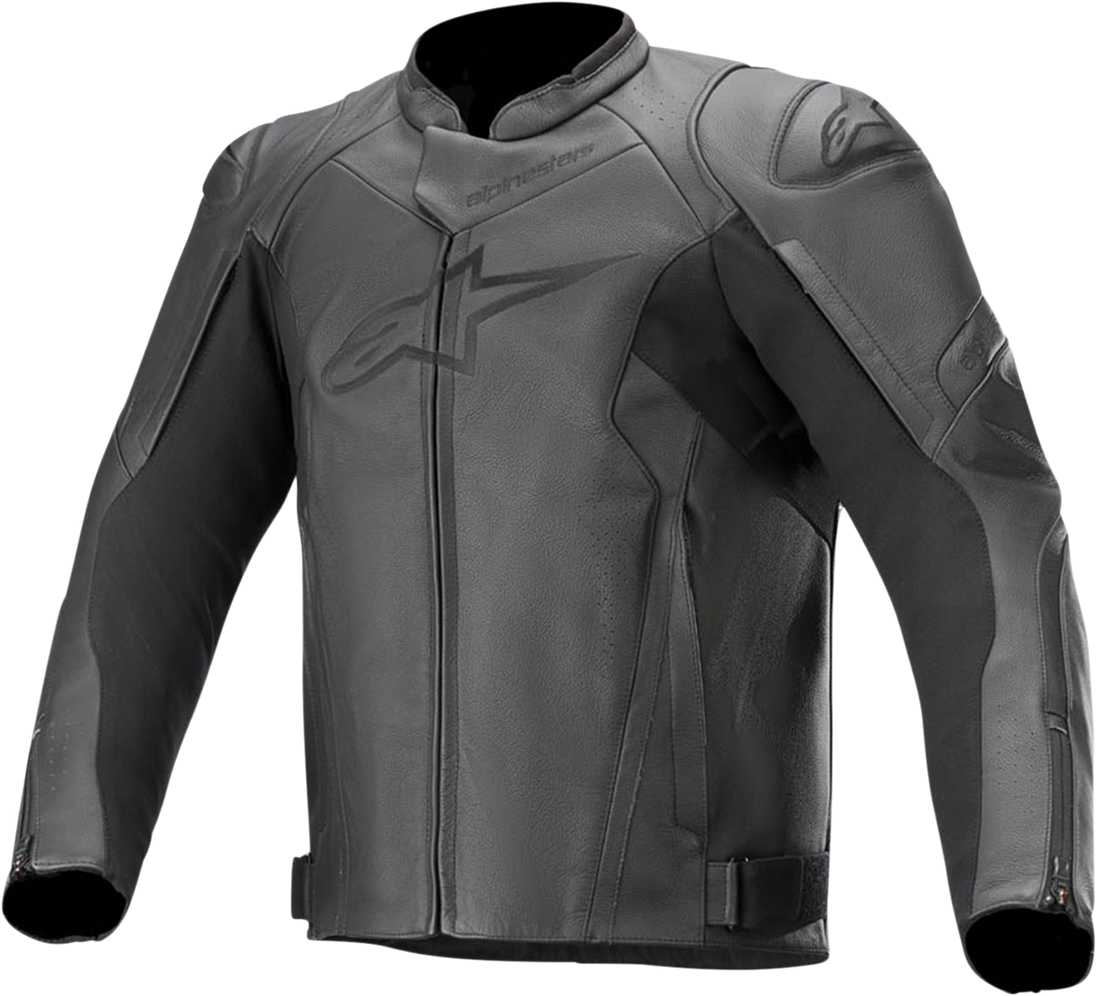 Faster v2 Leather Jacket - Black - US 42 / EU 52 Faster v2 Leather Jacket A combination of snap button and wrist zipper closures for a secure and customized fit Extensive, advanced poly fabric stretch inserts on the chest, underarm and rear shoulder for an optimum fit Ventilation inlets on the shoulders for high levels of airflow are zippered for ease of use Strategically positioned localized perforations for superior ventilation Perforated padded panels integrated into main shell and sleeves for an improved fit Soft 3D mesh collar construction plus 3D mesh cuff edging for comfort with a mesh liner construction for enhanced breathability, comfort and ventilation Hook and loop waist adjustment for an optimized fit External, large-opening front hand pockets are zippered for peace-of-mind security Multiple internal compartment pockets feature a hook and loop closure for additional security Interior waterproof wallet pocket for safe storage of documents/electronics Waist connection zipper allows attachment to Alpinestars riding pants Rear of the jacket is elongated for enhanced coverage when riding Snap-button system to integrate the Level 2 Alpinestars Nucleon back protector New shoulder protection features an over-molded advanced TPU guard layered under the outer fabric for additional impact protection Alpinestars Nucleon Flex Plus removable internal shoulder and elbow protectors ensure protection against impacts while being extremely flexible