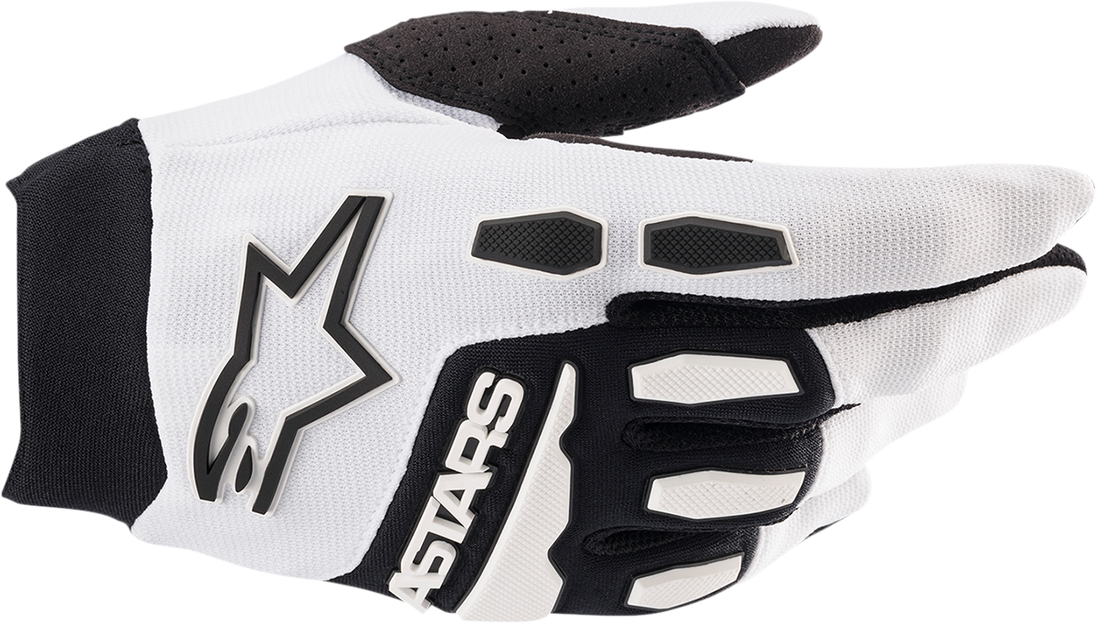 Full Bore Gloves - White/Black - Large Full Bore Gloves Neoprene and TPR on the knuckle area offers enhanced protection against impacts and possible branches/rock strikes when trail riding for comfort Ergonomic padded palm for optimal comfort on the handlebar/grips for long riding sessions Upper constructed from a breathable stretch fabric for comfort and fit Silicon print on fingertips for optimized grip with the bike’s controls Synthetic suede palm for high levels of durability and grip Stretch fourchettes for optimal levels of comfort and flexibility Reinforced thumb patches for durability and abrasion resistance Stretch cuff for an optimized fit with a strap closure