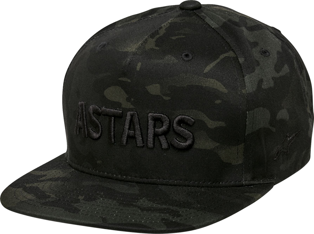Gillis Hat - Black/Black - One Size Gillis Hat Flat bill with structured crown Twill all-over camo print main fabric ASTARS word with 3D embroidery Embroidered Ageless logo on left side of the hat 98% Cotton / 2% Polyurethane Internal and back labeling