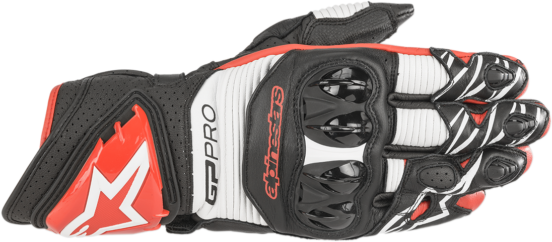 GP Pro R3 Gloves - Black/White/Bright Red - Small GP Pro R3 Gloves Outer seam palm construction for enhanced levels of rider comfort GP Pro R3 is anatomically engineered for performance, protection and comfort Mix of bovine, goat and kangaroo(palm) leather for superior performance Alpinestars exclusive Dynamic Friction Shield (DFS) protectors with advanced airflow ventilation and aramidic reinforcement for superior performance Finger bridge on the third and fourth finger prevents finger roll and separation in the event of a slide Dynamic Friction Shield on the cuff for high levels of abrasion resistance Side reinforcements with palm hard slider for superior abrasion resistance Accordions in leather on fingers thumb and backhand to increase fit and direct comfort Aramidic lining on the backhand and landing zone for added protection Thumb and palm reinforcement for a superior grip Soft padding on fingertips and ergonomic stretch insert on palm for enhanced levels of rider comfort TPU finger protection for superior protection against impacts Ergonomic stretch insert on palm for enhanced levels of rider comfort Knuckle panel perforated gusset for improved levels of hand ventilation Double closure system for security