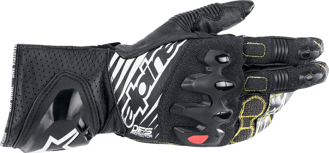 GP Tech V2 S Gloves - Black/White - 3XL GP Tech V2 S Gloves Minimal stitching increases comfort while reducing the risk of stitching failure in the event of mechanical stress External finger seams combine the perfect blend of feel and flexibility DuPont™ KEVLAR® stretch and leather back hand for optimal flexibility, freedom of movement, reduced fatigue and sensitivity and dexterity Innovative over-injected, ergonomic, dual density, seamless, race-derived knuckle protection which brings multiple performance Unrivalled flexibility combined with precise and race-proven control Goat palm construction with Kevlar stretch insert for additional protection in a key zone ARshield layers on backhand, landing zone and fingertips for additional protection Viscolelastic backhand /finger layer for protection against impacts Seamless over-injected dual density knuckle cup delivers Level 2 impact protection in a compact component, while also being flexible and allowing unobtrusive hand movements New ergonomic shape knuckle protector covers the metatarsal for enhanced protection DFS cuff delivers impact protection and friction control in a dual density Tested and approved by Alpinestars athletes New Cuff DFS, over injected fingertip sliders, dual closure system, palm slider, side hand reinforcement and Alpinestars race finger bridge Accordion flexion zones on control fingers