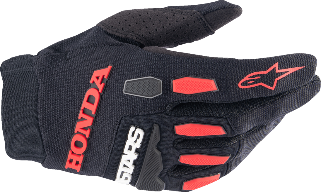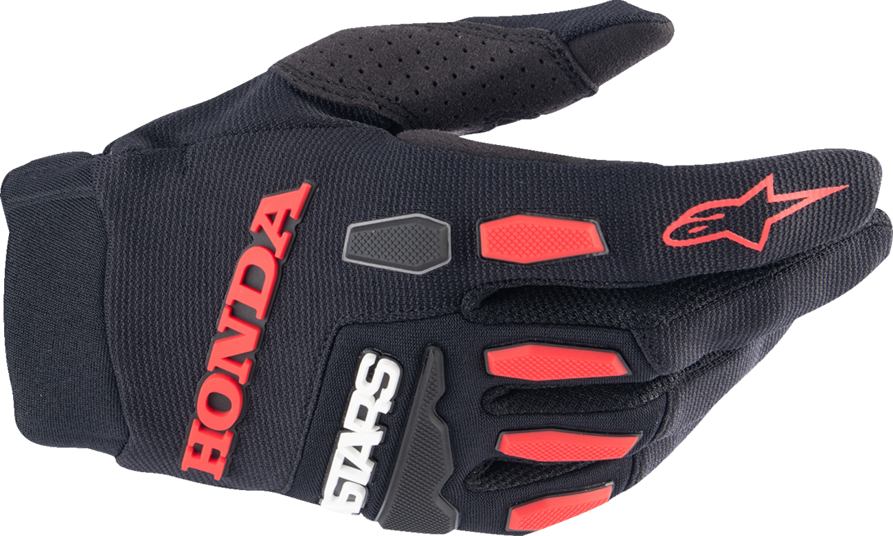 Honda Full Bore Gloves - Black/Bright Red - Large Honda Full Bore Gloves Stretch fourchettes for optimal levels of comfort and flexibility Reinforced thumb patches for enhanced durability and abrasion resistance Silicon print on fingertips for optimized grip Synthetic suede palm for high levels of durability and grip Constructed from breathable stretch fabric for rider comfort and optimal fit Ergonomic padded palm for optimal comfort on the handlebar/grips Conductive palm for use with smartphones Neoprene and TPR on knuckle area offers enhanced protection for impact and supremely flexible for comfort Ergonomic wrist adjustment provides a secure, customized fit