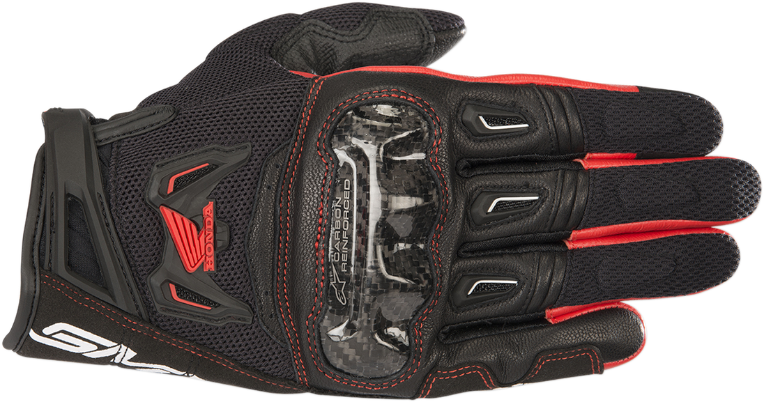 Honda SMX-2 Air Carbon V2 Gloves - Black/Red - Large Honda SMX-2 Air Carbon V2 Gloves Multi-panel main shell construction incorporating full-grain leather and 3D mesh for durability, abrasion resistance and high levels of breathability An innovative microfiber and PU grip insert strategically positioned on palm and thumb for excellent levels of grip control and durability Ergonomically shaped Alpinestars’ innovative carbon knuckle guard provides exceptional impact and abrasion protection Guard is reinforced on the interior side with thick EVA foam for fit, comfort and shock absorption Ergonomic stretch insert between palm and thumb offers improved range of hand movement and greater sensitivity Incorporates premium quality suede palm and landing reinforcement for grip, control and durability Finger tops and back hand incorporates poly mesh, TPR inserts for additional impact abrasion and ventilation in critical areas Impact absorbing EVA foam panels on thumb for impact performance and 3D mesh finger and thumb surfaces for cooling performance Pre-curved finger construction to reduce riding fatigue Neoprene wrist cuff plus velcro and TPR closure for secure and personalized closure Stretch finger sidewalls for improved flexibility and comfort Touchscreen compatible index fingertip and thumb