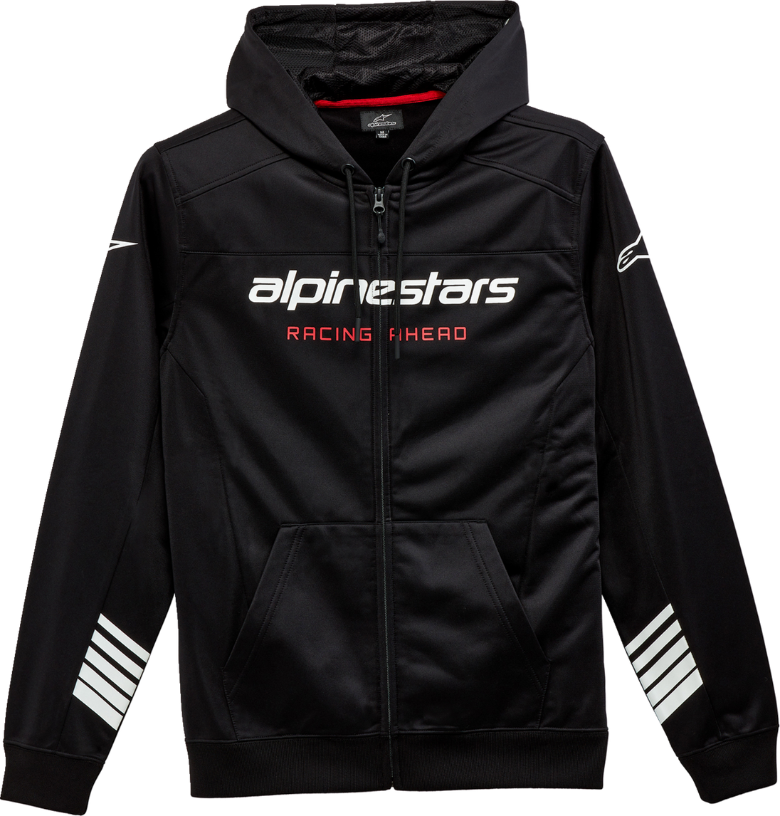 Session LXE Fleece - Black/Black - Large Session LXE Fleece Hooded zip-front 100% polyester fleece with contrast panels Mesh lined hood, tech draw cords, rib cuffs and hem Alpinestars word logo and graphics on chest and arms Internal main label and external label branding