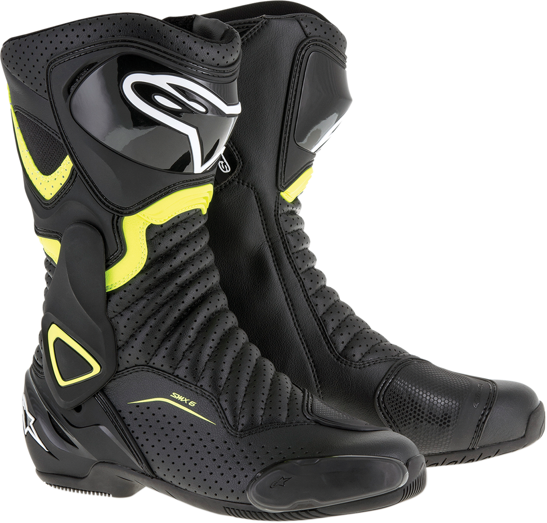 SMX-6 v2 Vented Boots - Black/Yellow - US 6.5 / EU 40 SMX-6 v2 Vented Boots Boot upper incorporates an innovative front and rear bellows and rear calf zone for superior levels of flexibility Boot upper is constructed from microfiber for durability and abrasion resistance Ergonomic forefoot streamlining enables greater control of the bike's controls and provides a superior, wide-ranging foot profile for excellent fit and comfort Thermoplastic Polyurethane (TPU) lateral ankle brace provides a biomechanical support between the lateral top calf/shin and ankle and provides improved structural integrity, protection against impact shocks, repeated abrasion resistance and flex support Air vents on the heel counter and shin plate plus breathable mesh inserts improve comfort and reduce fatigue on the ride (vented boot styles only) High modulus TPU-injected shin guard, calf protector, heel counter, shift pad, ankle brace and toe slider for improved shock protection and durability Double-density ankle protector on the medial side, layered under the upper, offers protective performance in key areas Integrated, replaceable bi-injected TPU slider features a new easy-screw fixing concept for quicker, easier replacement Innovative instep and Achilles accordion flex zone construction for superior comfort, extension, control and support Internal insole with shake reinforcement integrated for support to the arch area and foot protection Medial side entry opening/closure system features elastic-mounted zipper with wide hook-and-loop closure for flexibility and a secure fit Aperture opening is large to promote easy in/out of the boot Internal toe box protection is layered under the upper for durability, improved feel and performance Breathable textile interior lining features anti-sliding suede reinforcement on the heel area to help keep the foot in position while riding Removable anatomic footbed includes EVA and stretch fabric for performance, comfort and support Rubber compound sole promotes improved feel and grip, water dispersion and durability