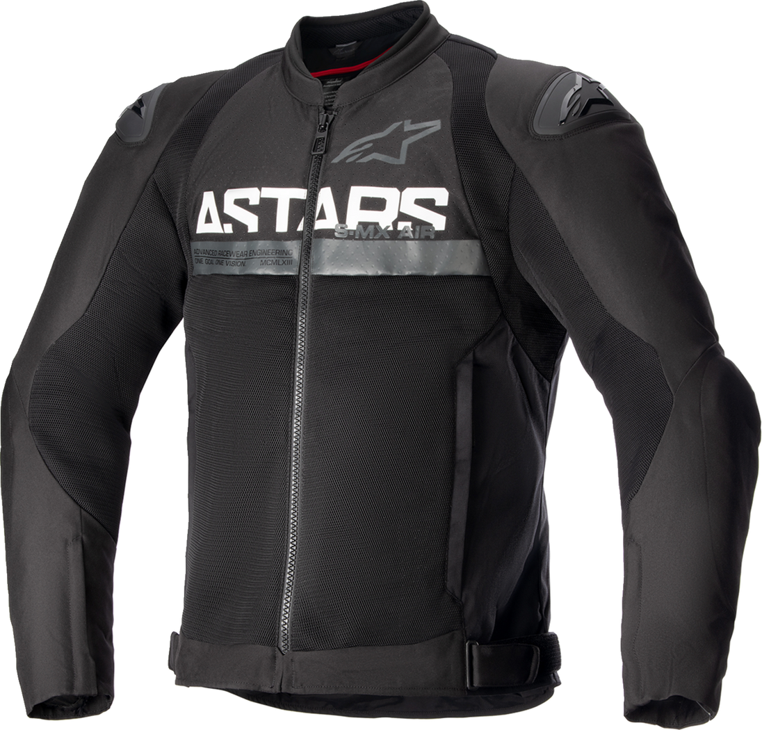 SMX Air Jacket - Black - 2XL SMX Air Jacket A motocross inspired textile jacket, the SMX Air Jacket features a main chassis constructed from tech mesh on the rider’s abdomen, back, and inner arms, paired with 450D polyfabric reinforcement on the outer arms and shoulders The SMX Air also incorporates perforated 450D polyfabric on the upper chest for excellent levels of airflow during the warm, summer riding months Extended polyamide stretch material has been incorporated on the rider’s back shoulders and sides, with a high density stretch material on the upper back The stretch material not only provides for an adaptive fit and freedom of movement, as well as offers the perfect expansion ability for use with the Tech-Air® 5 Airbag System As the SMX Air Jacket provides premium ventilation, the jacket also comes with a detachable windbreaker liner to help reduce airflow when it’s not needed, providing optimal climate comfort and versatility DFS Lite external shoulder sliders paired with Nucleon Flex Plus shoulder, elbow, and forearm armor provide impact The highly ventilated, SMX Air Jacket is the perfect choice for the every-day commuter and weekend rider looking for a versatile and protective street sport jacket for riding in warm climates Tech-Air® ready Tech mesh chassis with mechanical stretch combined with polyfabric 450D perforated in key areas including the chest panel Strategic stretch inserts on side torso and upper back panel Ergonomic design for optimal sport movement and flexibility Detachable windproof liner Waist adjusters Waterproof compartment DFS lite shoulder external protectors New inner construction for Nucleon protection insert upgrades, ready to accommodate the new Alpinestars’ long back protector insert Nucleon Flex Plus armor