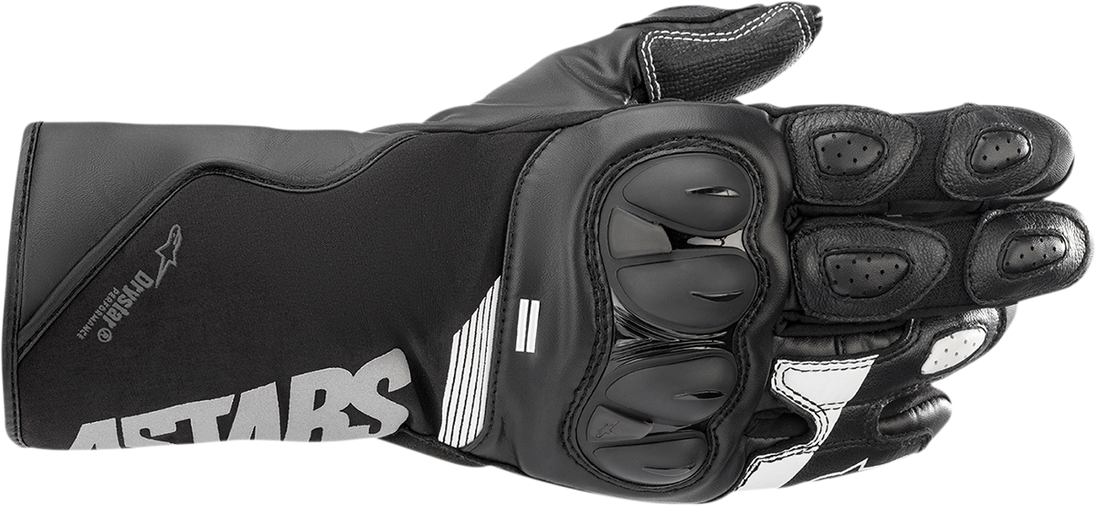 SP-365 Drystar® Gloves - Black/White - 3XL SP-365 Drystar® Gloves Constructed with Alpinestars 100% waterproof Drystar® performance membrane construction technology (palm only), thereby affording a highly reduced material chassis to promote dexterity and sensitivity of bike controls Constructed from a supple and highly durable PU and softshell chassis to provide core abrasion resistance and durability Leather on palm for superior abrasion resistance in a key area Advanced poly-textile reinforcements on palm and thumb provides superior grip on bike’s controls Synthetic leather reinforced outer hand with padding on landing zones provide maximum abrasion resistance Alpinestars developed ergonomic stretch insert between thumb and palm offers flexibility to vastly improve hand movement Durable new flexible Alpinestars SP knuckle protection provides class-leading impact and abrasion protection, and incorporates heat stamped logo Palm, fingers and backhand padded with energy absorbing EVA foam for improved comfort and fit Drystar® membrane offers effective weather protection in wet conditions Printed logos for weight-saving and material integrity