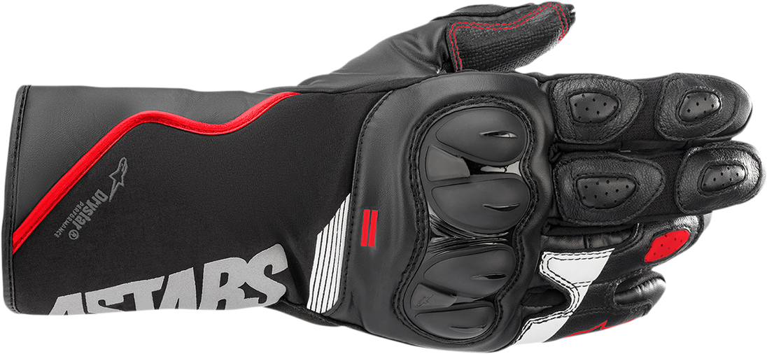 SP-365 Drystar® Gloves - Black/Fluo Red/White - 2XL SP-365 Drystar® Gloves Constructed with Alpinestars 100% waterproof Drystar® performance membrane construction technology (palm only), thereby affording a highly reduced material chassis to promote dexterity and sensitivity of bike controls Constructed from a supple and highly durable PU and softshell chassis to provide core abrasion resistance and durability Leather on palm for superior abrasion resistance in a key area Advanced poly-textile reinforcements on palm and thumb provides superior grip on bike’s controls Synthetic leather reinforced outer hand with padding on landing zones provide maximum abrasion resistance Alpinestars developed ergonomic stretch insert between thumb and palm offers flexibility to vastly improve hand movement Durable new flexible Alpinestars SP knuckle protection provides class-leading impact and abrasion protection, and incorporates heat stamped logo Palm, fingers and backhand padded with energy absorbing EVA foam for improved comfort and fit Drystar® membrane offers effective weather protection in wet conditions Printed logos for weight-saving and material integrity