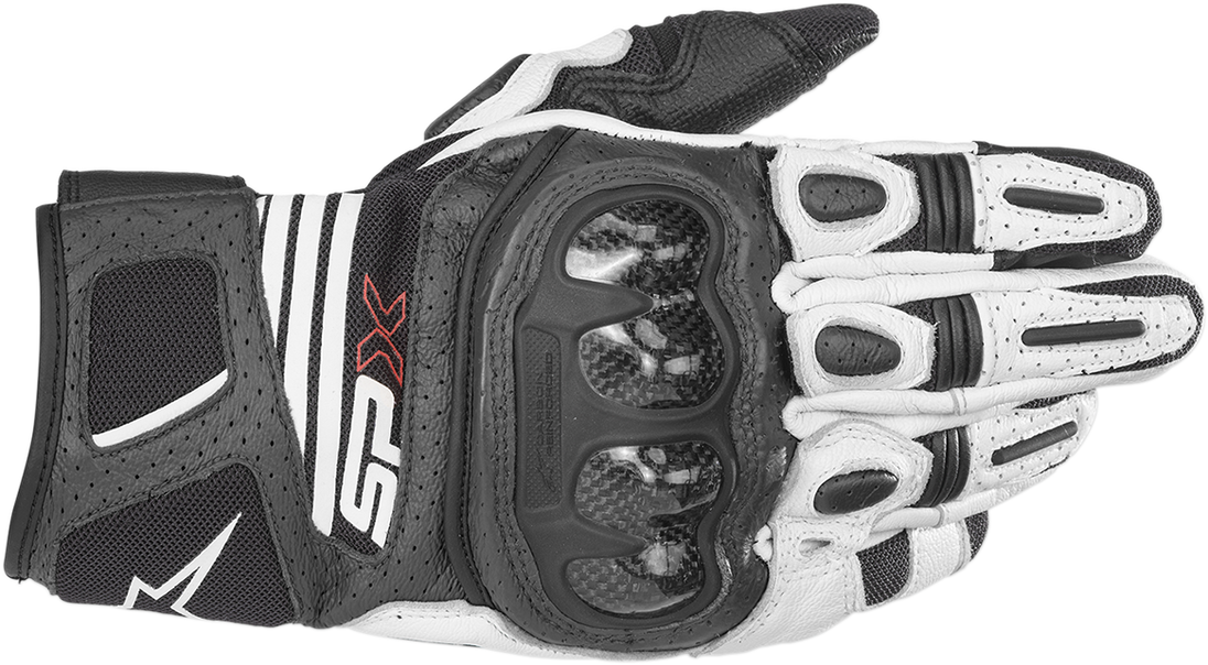 SPX AC V2 Gloves - Black/White - Large SPX Air Carbon V2 Gloves Outer seam palm construction for enhanced levels of rider comfort; Short vented summer glove Features a leather and mesh chassis to provide optimal ventilation for warm weather performance riding Incorporating innovative carbon and polymer compound protection, this pre-curved glove is fully optimized for warm weather performance riding Hard carbon knuckle for superior resistance to impacts Knuckle panel with perforated gusset construction to increase flexibility Full perforated leather with open stretch mesh for improved ventilation Side reinforcements with hard palm slider for superior abrasion resistance Accordions on fingers to increase fit and direct comfort Thumb and palm reinforcement for a superior grip Ergonomic stretch insert on palm and soft padding on fingers and cuff for greater rider comfort TPR inserts on fingertips
