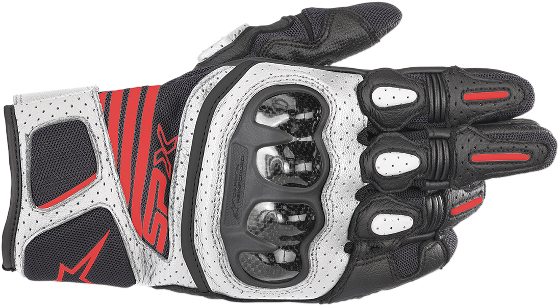 SPX AC V2 Gloves - Black/White/Fluo Red - Medium SPX Air Carbon V2 Gloves Outer seam palm construction for enhanced levels of rider comfort; Short vented summer glove Features a leather and mesh chassis to provide optimal ventilation for warm weather performance riding Incorporating innovative carbon and polymer compound protection, this pre-curved glove is fully optimized for warm weather performance riding Hard carbon knuckle for superior resistance to impacts Knuckle panel with perforated gusset construction to increase flexibility Full perforated leather with open stretch mesh for improved ventilation Side reinforcements with hard palm slider for superior abrasion resistance Accordions on fingers to increase fit and direct comfort Thumb and palm reinforcement for a superior grip Ergonomic stretch insert on palm and soft padding on fingers and cuff for greater rider comfort TPR inserts on fingertips