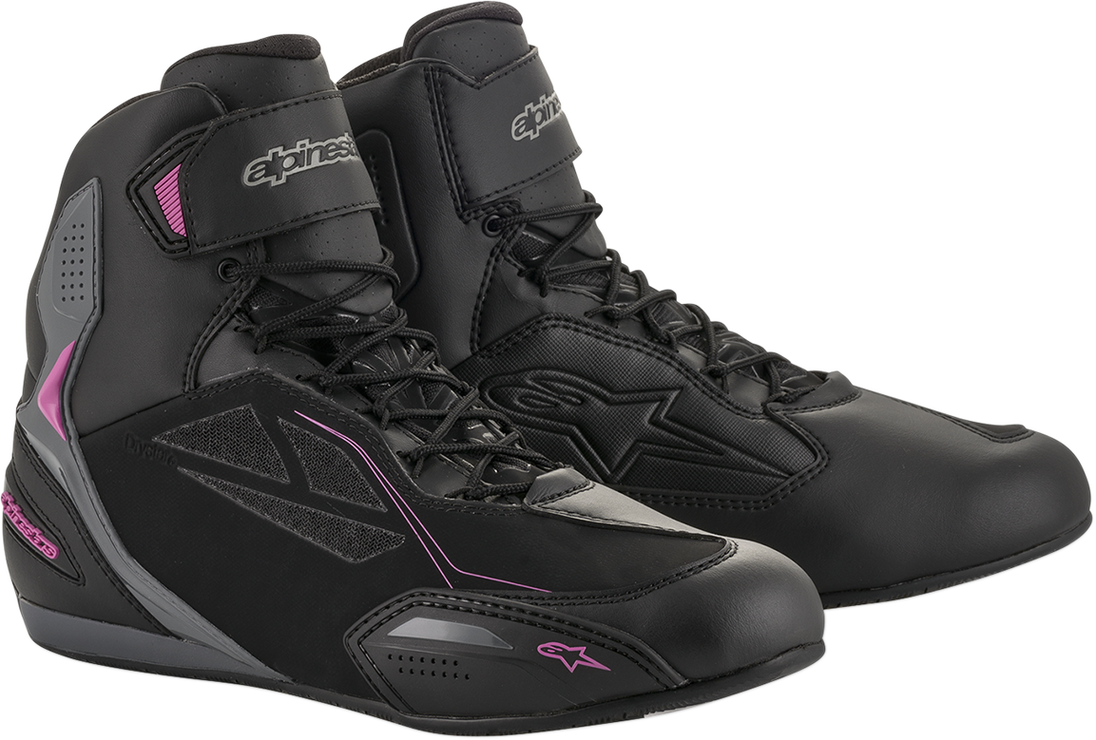 Faster-3 Drystar® Shoes - Black/Gray/Pink - US 6 Stella Faster-3 Drystar® Shoes Engineered specifically for women Main upper material combination of advanced microfiber, PU suede and seamless thermo-welded microfiber for durability and abrasion resistance Air ventilation details on lateral quarter with mesh openings for breathability New TPR heel counter design ensures additional lateral support and security Asymmetric toe design gives protection on shift area Traditional lace closure system for an easy, secure and comfortable fit Lateral adjustable hook and loop closure system with TPR strap for increased security Tongue and collar padding provides high levels of comfort and fit around the ankle and instep Internal toe box and heel counter reinforcement is layered under the upper for a more ergonomic design Drystar® membrane within chassis gives 100% performance against wet penetration Replaceable anatomical EVA footbed with Lycra lining on top Extremely lightweight, specifically compounded, rubber sole provides textured grip, excellent absorption and features an integrated support shank for enhanced sole rigidity