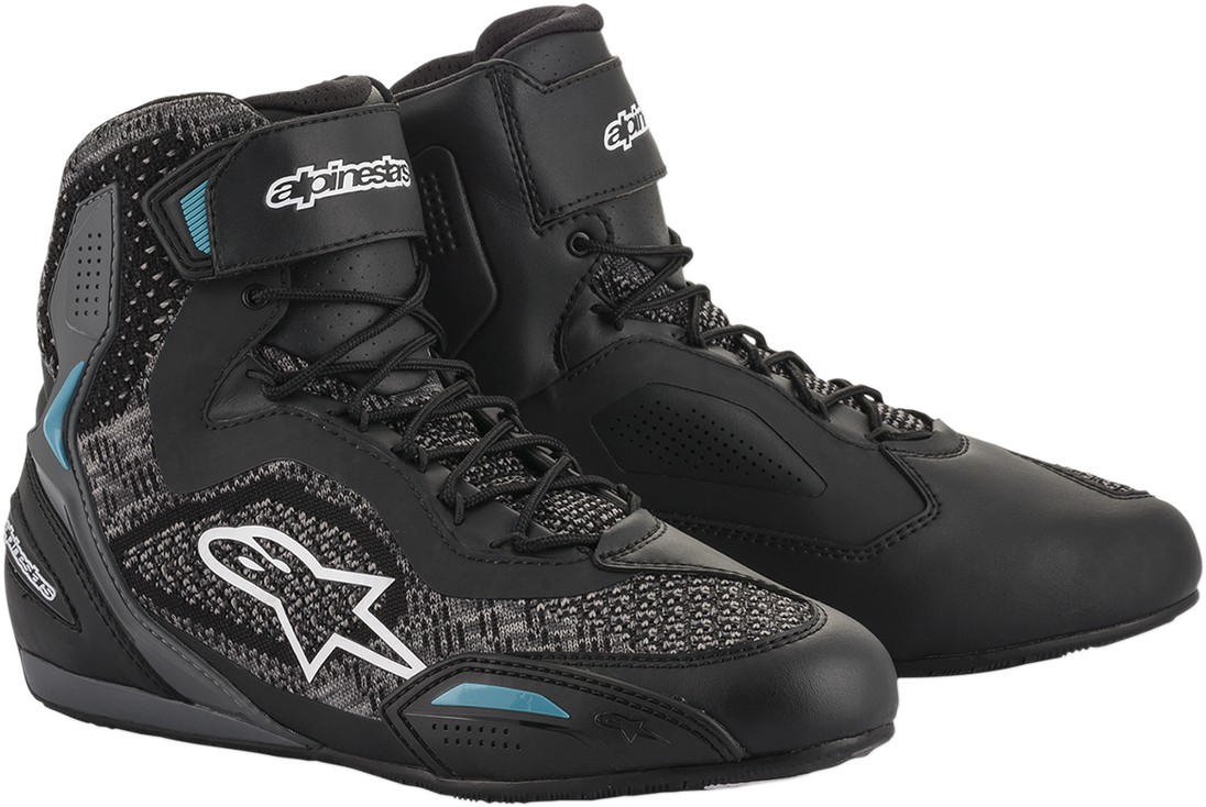 Stella Faster-3 Rideknit Shoes - Black/Teal - US 7.5 Stella Faster-3 Rideknit Shoes Main upper material combination of advanced microfiber, knitted mesh and seamless thermo-welded microfiber forms an innovative and technical finish Anatomically profiled for a fully optimized female fit Lower tongue, lateral and medial quarter in knitted mesh construction allows breathability, comfort and a modern streetwear look Air vent details on lateral and toe area are strategically positioned to improve airflow and ventilation Enhanced TPU ankle extended into lower lateral area gives improved support and protection TPR slider details on lateral toe box gives increased flex and protection New TPR heel counter design ensures additional lateral support and security Asymmetric toe design gives protection on shift area Traditional lace closure system for an easy, secure and comfortable fit Lateral adjustable hook and loop closure system with TPR strap for increased security Medial dual density ankle protectors are applied between the upper and padded lining to provide strategic protection and flexibility in key areas Tongue and collar padding provides high levels of comfort and fit around the ankle and instep Internal toe box and heel counter reinforcement is layered under the upper for a more ergonomic design 3D mesh lining for high levels of breathability with anti-slip micro-suede in the heel Replaceable anatomical EVA footbed with Lycra lining on top Extremely lightweight, specifically compounded, rubber sole provides textured grip, excellent absorption and features an integrated support shank for enhanced sole rigidity