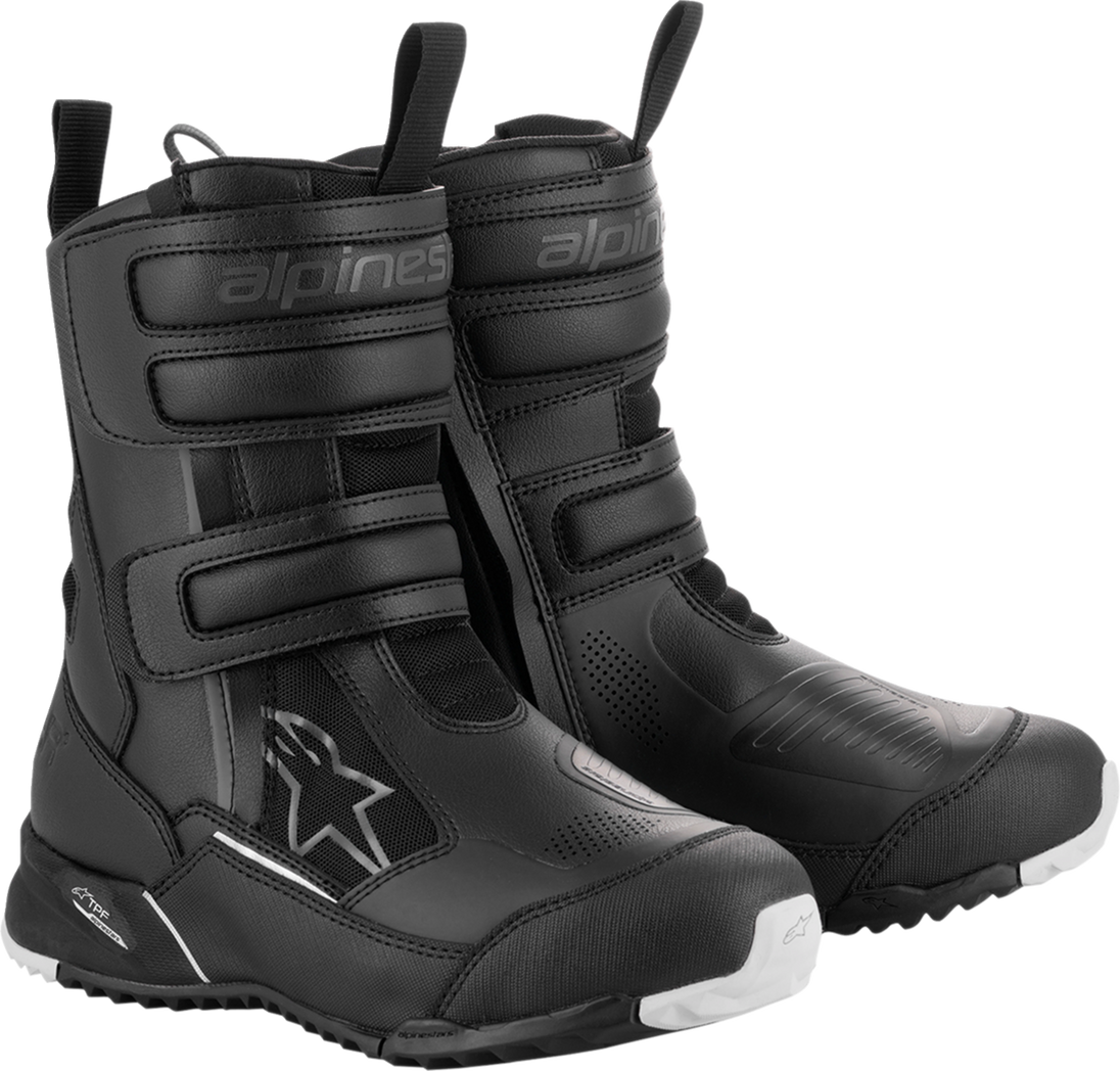Stella RT-7 Drystar® Boots - Black - US 9 Stella RT-7 Drystar® Boots RT-7 has a full Drystar® membrane for 100 percent guaranteed waterproof performance and breathability Technical modern upper constructed with an advanced blend of microfiber and synthetic high resistance textile laminated by a seamless PU for enhanced breathability Alpinestars integrated Transversal Protection Frame (TPF), protects the foot while delivering the necessary support on the footrest without compromising the front foot flexion for superior walking comfort Reinforced heel counter and toe box, with an additional shift pad extra layer and a reinforced shin area to protect against impacts The boot opening is managed by lateral zip mounted on elasticated panel, covered by a hook and loop gusseted flap to protect the zipper and keep free the boot flexion Main upper material constructed with high abrasion textile with reflective dots for enhanced flexibility Internal shin plate reinforcement for enhanced shin protection New dynamic design shift pad in 3D print PU technology for effective upper foot protection Internal toe box and heel counter protection is layered under the upper for durability, improved feel and performance Lateral side entry system with an elastic mounted zipper and a wide hook and loop flap for convenience and a precise, secure fit Drystar® membrane for proven performance in difficult weather conditions Shin plate and medial side constructed with microfiber and textile with reflective dots for enhanced durability and abrasion resistance Double density ankle disk protection is mounted under the leather on the lateral and medial side for impact Soft PU on the lateral side provides additional lateral protection in a key area Front and rear bellow constructed with a combination of textile material and soft lightweight stretch PU for Rear puller for easy entry/exit Sole constructed with lightweight rubber compound for excellent grip on the pegs, enhanced rear flexion and comfort Removable anatomic EVA footbed with Lycra lining on top for comfort