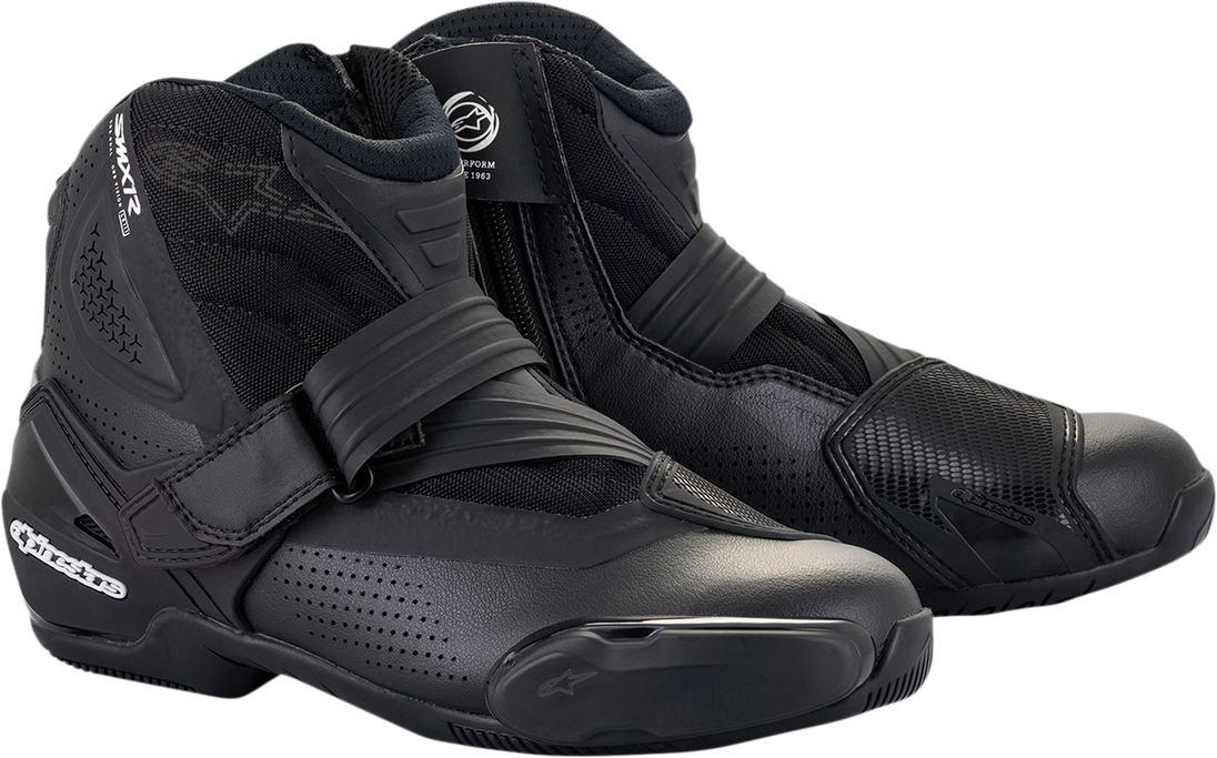Stella SMX-1 R V2 Boots - Black - US 6 / EU 37 Stella SMX-1 R V2 Boots Anatomically engineered for an optimized women’s fit Rear flex bellow is equipped with a flex window, which also acts as an air intake for effective ventilation and airflow New ergonomic TPU shift pad for enhanced durability in a critical area Main upper constructed from an advanced microfiber for comfort, durability and excellent of abrasion resistance Rear of heel counter has been designed with soft TPR insert which works seamlessly with the rear flex zone to allow for improved freedom of ankle movement and comfort on the bike’s controls Innovative heel counter support system, which works in conjunction with a strap closure to offer improved fit and support, as well as structural integrity Extensive perforations throughout for maximum airflow, with a front bellow constructed from textile material for enhanced breathability Ergonomic boot shaping for forefoot streamlining which offers wide-ranging foot profile fit and comfort Strap features TPR puller for ease of use Aramidic fiber wires ensure the new strap closure system is durable, thin and lightweight Evolved closure strap is anatomically angled to follow natural shape of rider’s instep Alpinestars exclusive compound rubber sole with grip patterning to promote improved feel and grip, water dispersion and durability Front Velcro® closure system offers a quick and secure fit over the instep area while permitting excellent levels of flex Sole features integrated Alpinestars TPF (Transversal protection Frame) to protect against possible transversal loads Instep and Achilles’ accordion flex zones are constructed from lightweight microfiber for optimized levels of durability, comfort and maneuverability on and off the bike Thermowelded flex grooves to control the flexion and flexibility of the shoe; instep, medial and back Integrated, replaceable bi-injected TPU forefoot slider features new easy-screw fixing concept for quicker and easier replacement Reverse zip closure ensures convenient in and out Double density ankle protector on both sides layered under the upper offers protective performance and abrasion resistance in key area External, high modulus TPU heel counter, lateral ankle and shift pad for improved shock protection and durability Internal toe box protection is layered under the upper for durability, improved feel and performance Removable anatomic foot-bed includes EVA foam and Lycra® for comfort and support Internal mesh lining for cooling comfort and moisture-wicking