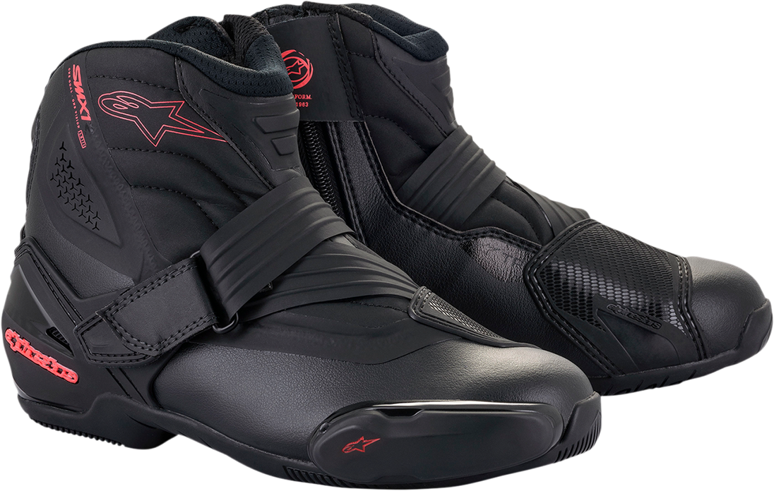 Stella SMX-1R V2 Boots - Black/Pink - US 11 / EU 43 Stella SMX-1R V2 Boots Anatomically engineered for an optimized women’s fit Main upper constructed from an advanced microfiber for comfort, durability and excellent of abrasion resistance Innovative heel counter support system, which works in conjunction with a strap closure to offer improved fit and support, as well as structural integrity Rear of heel counter has been designed with soft TPR insert which works seamlessly with the rear flex zone to allow for improved freedom of ankle movement and comfort on the bike’s controls Rear flex bellow is equipped with a flex window, which also acts as an air intake for effective ventilation and airflow New ergonomic TPU shift pad for enhanced durability in a critical area Ergonomic boot shaping for forefoot streamlining which offers wide-ranging foot profile fit and comfort Evolved closure strap is anatomically angled to follow natural shape of rider’s instep Front Velcro® closure system offers a quick and secure fit over the instep area while permitting excellent levels of flex. Strap features TPR puller for ease of use Aramidic fiber wires ensure the new strap closure system is durable, thin and lightweight Alpinestars exclusive compound rubber sole with grip patterning to promote improved feel and grip, water dispersion and durability Sole features integrated Alpinestars TPF (Transversal protection Frame) to protect against possible transversal loads Instep and Achilles’ accordion flex zones are constructed from lightweight microfiber for optimized levels of durability, comfort and maneuverability on and off the bike Thermowelded flex grooves to control the flexion and flexibility of the shoe; instep, medial and back Reverse zip closure ensures convenient in and out Double density ankle protector on both sides layered under the upper offers protective performance and abrasion resistance in key area Integrated, replaceable bi-injected TPU forefoot slider features new easy-screw fixing concept for quicker and easier replacement External, high modulus TPU heel counter, lateral ankle and shift pad for improved shock protection and durability Internal toe box protection is layered under the upper for durability, improved feel and performance Removable anatomic foot-bed includes EVA foam and Lycra® for comfort and support Internal mesh lining for cooling comfort and moisture-wicking