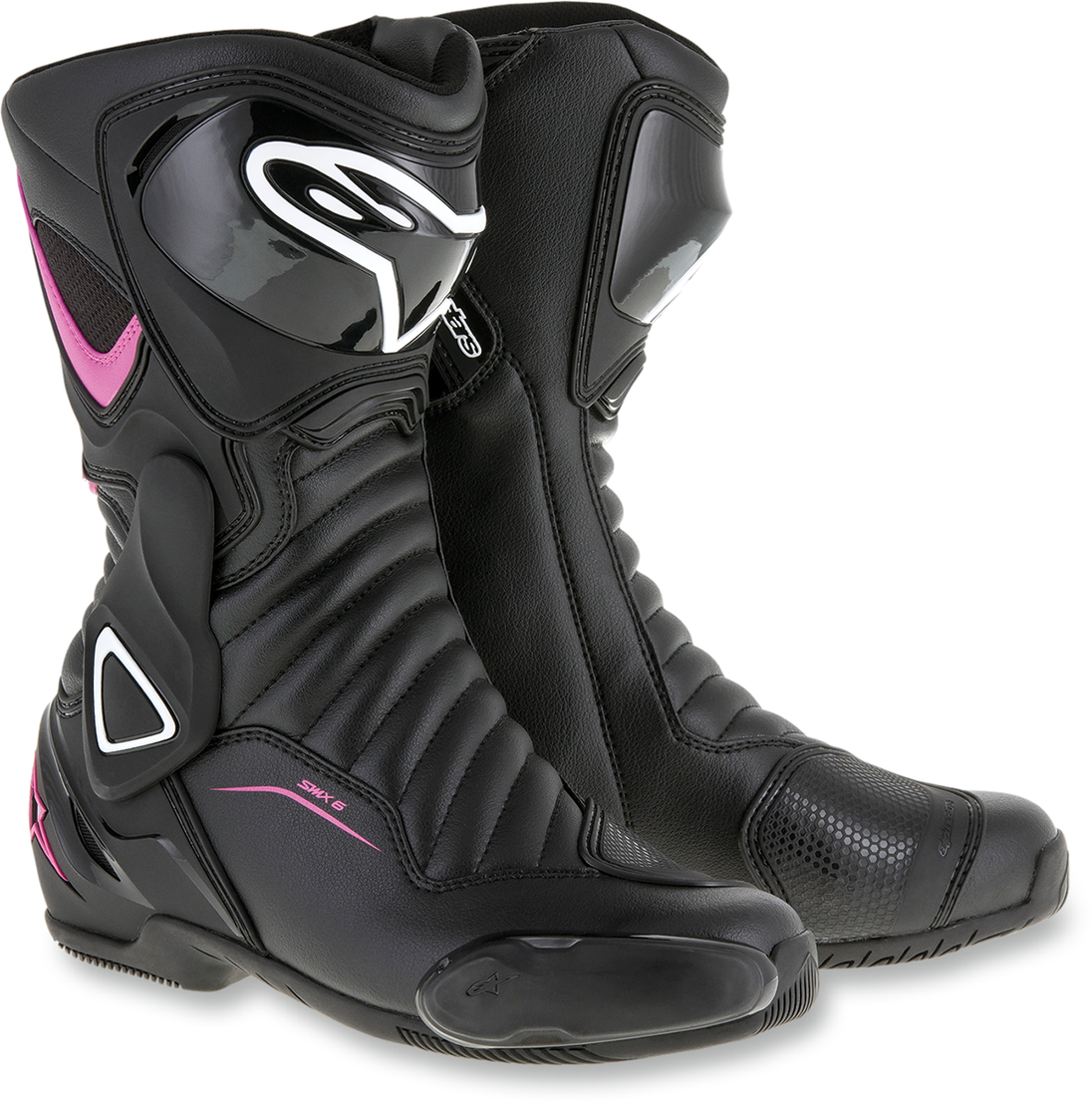 SMX-6 v2 Vented Boots - Black/Pink/White - US 7 / EU 38 Stella SMX-6 v2 Vented Boots Designed and constructed specifically for a women's performance fit Boot upper design incorporates an innovative front and rear bellows and rear calf zone for superior levels of flexibility Boot upper is constructed from microfiber for durability and abrasion resistance Ergonomic forefoot streamlining enables greater control of the bike's controls and provides a superior, wide-ranging foot profile for excellent fit and comfort TPU lateral ankle brace provides a biomechanical support between the lateral top calf/shin and ankle and provides improved structural integrity, protection against impact shocks, repeated abrasion resistance and flex support Air vents on the heel counter and shin plate plus breathable mesh inserts improve comfort and reduce fatigue on the ride (vented boot styles only) High modulus TPU-injected shin guard, calf protector, heel counter, shift pad, ankle brace and toe slider for improved shock protection and durability Double-density ankle protector on the medial side, layered under the upper, offers protective performance in key areas Integrated, replaceable bi-injected TPU slider features a new easy-screw fixing concept for quicker, easier replacement Innovative instep and Achilles accordion flex zone construction for superior comfort, extension, control and support Internal insole with shake reinforcement integrated for support to the arch area and foot protection Medial side entry opening/closure system features elastic-mounted zipper with wide hook-and-loop closure for flexibility and a secure fit Aperture opening is large to promote easy in/out of the boot Internal toe box protection is layered under the upper for durability, improved feel and performance Breathable textile interior lining features anti-sliding suede reinforcement on the heel area to help keep the foot in position while riding Removable anatomic footbed includes EVA and stretch fabric for performance, comfort and support Rubber compound sole promotes improved feel and grip, water dispersion and durability