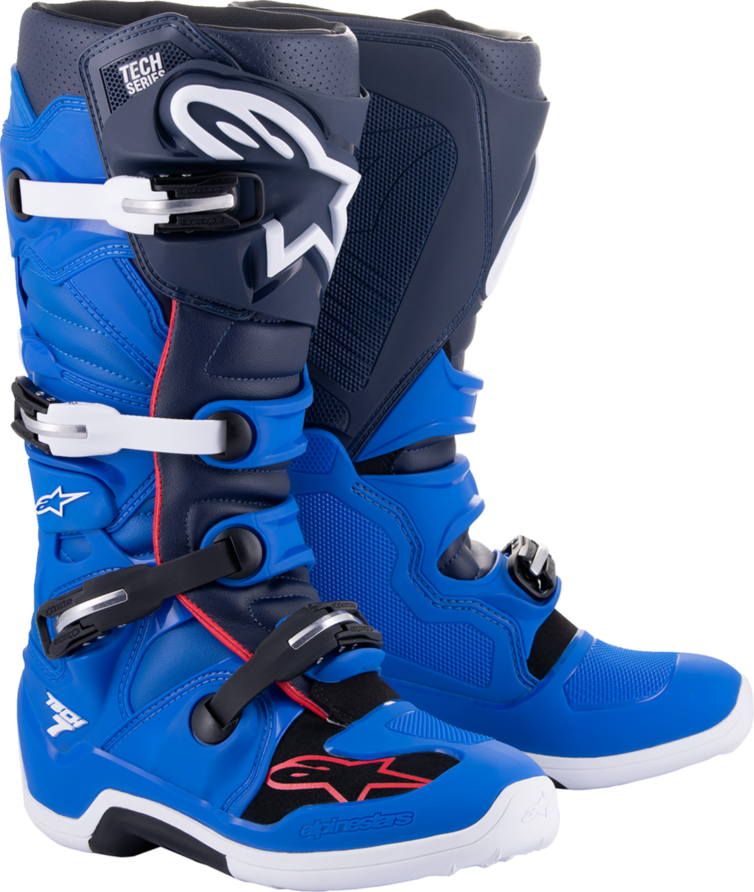 Tech 7 Boots - Blue/Red/Navy - US 13 Tech 7 Boots Upper is constructed from a light microfiber that provides flexibility and abrasion resistance Thermoplastic Polyurethane (TPU) shin-plate construction and a reinforced hook-and-loop closure offers a comfortable, highly customized fit TPU blade system provides flexibility while helping prevent frontal hyperextension Wide entry aperture and a hook-and-loop upper closure Thermoplastic Rubber (TPR) flap allows for a broad range of calf fit adjustments for comfort and support Single-piece TPU panel with honeycomb sculpturing for maximum grip contact with bike and improved heat and abrasion resistance on the medial facing area Top rear flexion of the boot is supported around the calf by an innovative TPU sliding blade system helps to dissipate friction Ergonomic buckle system offers secure and highly personalized fit Innovative TPU lateral ankle protection provides biomechanical link between the middle lateral and the bottom lateral of the boot Instep and Achilles accordion flex zones for superior support and control Toes protected by metal shank reinforced TPU shell Microfiber gaiter helps keep out water and dirt Polymer buckles with aluminum frames provide self-aligning, quick-release closures for personalized fit Breathable mesh 3D liner with anti-sliding microfiber suede reinforcement in the heel Shock absorbing soft poly-foam surrounds ankles and collar Removable anatomic footbed High-grip, double-density rubber outer sole is removable and replaceable