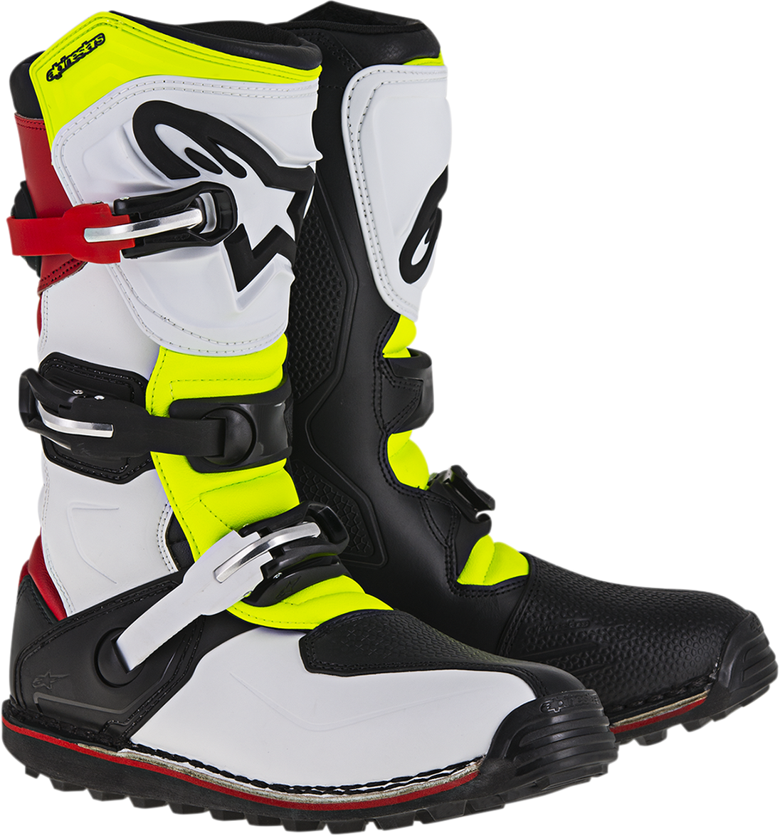 Tech-T Boots - White/Red/Yellow Fluorescent/Black - US 8 Tech-T Boots Upper constructed from a combination of full-grain leather and innovative microfiber for durability and abrasion resistance Extended front and rear accordion stretch zones for improved flex, control and support Double-density Thermoplastic polyurethane (TPU) ankle protector disks are layered under the upper and backed by poly-foam padding Ergonomically contoured shin plate is injected with high-modulus TPU for a high-level impact- and abrasion-resistance Wide entry aperture for convenience with hook-and-loop upper closure TPR flap to allow broad-ranging calf fit adjustment and support 3D mesh textile with open cell foam for improved air circulation and comfort Extended Polyurethane (PU) synthetic gaiter helps seal out excessive water and dirt entry Soft poly foam reinforcement on ankles and collar for long-lasting comfort and shock absorption Three buckles closure system with memory, featuring an integrated quick-release/locking system closure Buckles are injected with high-impact-resistant techno polymer Internal toe box and heel counter protection is layered under the upper for durability Leather shift pad for abrasion resistance and structural protection Polymer insole with integrated steel shank reinforcement for structure and support to the arch area Exclusive compound rubber sole with high grip, rough terrain design Outsole is replaceable Replaceable anatomic footbed for comfort and support ensures even weight distribution