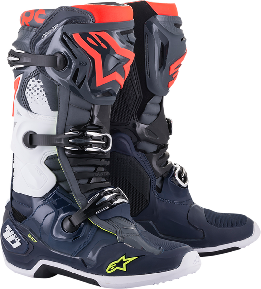 Tech 10 Boots - Dark Gray/Dark Blue/Red - US 13 Tech 10 Boots The most significant upgrades to the Tech 10 performance are unique technologies: The Frontal Flexion Control Frame, the Asymmetrical Dual-pivot Arms, the patented...Regular price $659.95 -