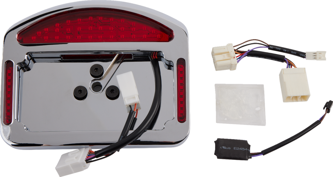 Taillight Eliminator - Universal - Chrome Eliminator™ Taillight Combine several components into one with the Eliminator™ Neatly replaces your existing taillight, turn signal assembly and 4" x 7" license plate mount Taillight assembly has built-in run, turn and brake controller Amber illuminating signals, except 14-15 FLHX Covers all existing holes and no painting required Plug-n-play harness LED lights Aluminum with chrome or black powder-coat finish Not DOT compliant. If bike is equipped with a factory alarm, it may require #2050-0012 (TSSM load equalizer).