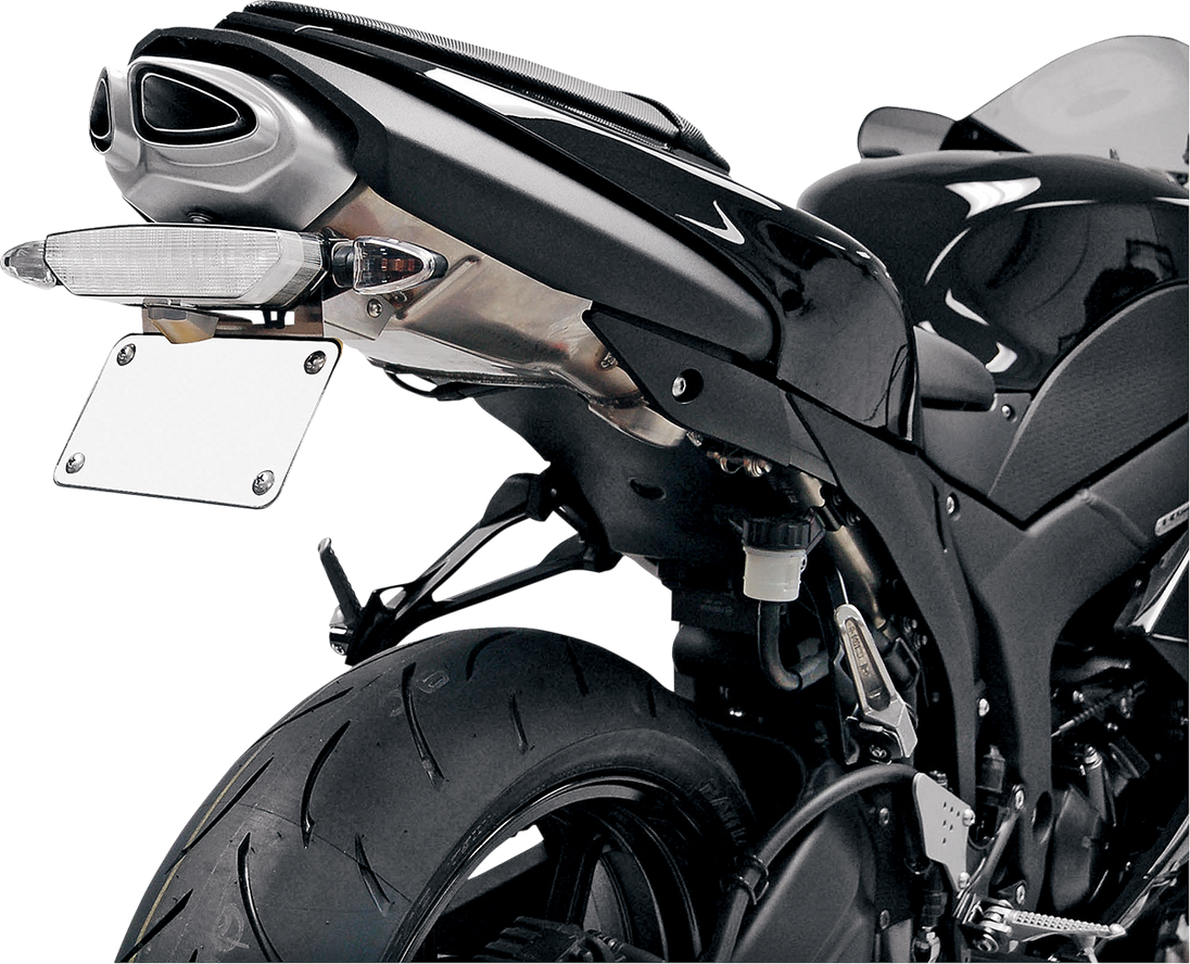 Fender Eliminator Kit - ZX6R Fender Eliminator Kit with Turn Signals Eliminate the rear fender to give your bike a cleaner race-style look Made from CNC laser-cut 304 stainless steel Flush-mount rear LED turn signals and LED license plate light included Hardware and instructions for easy installation Made in the U.S.A. Fitment:
