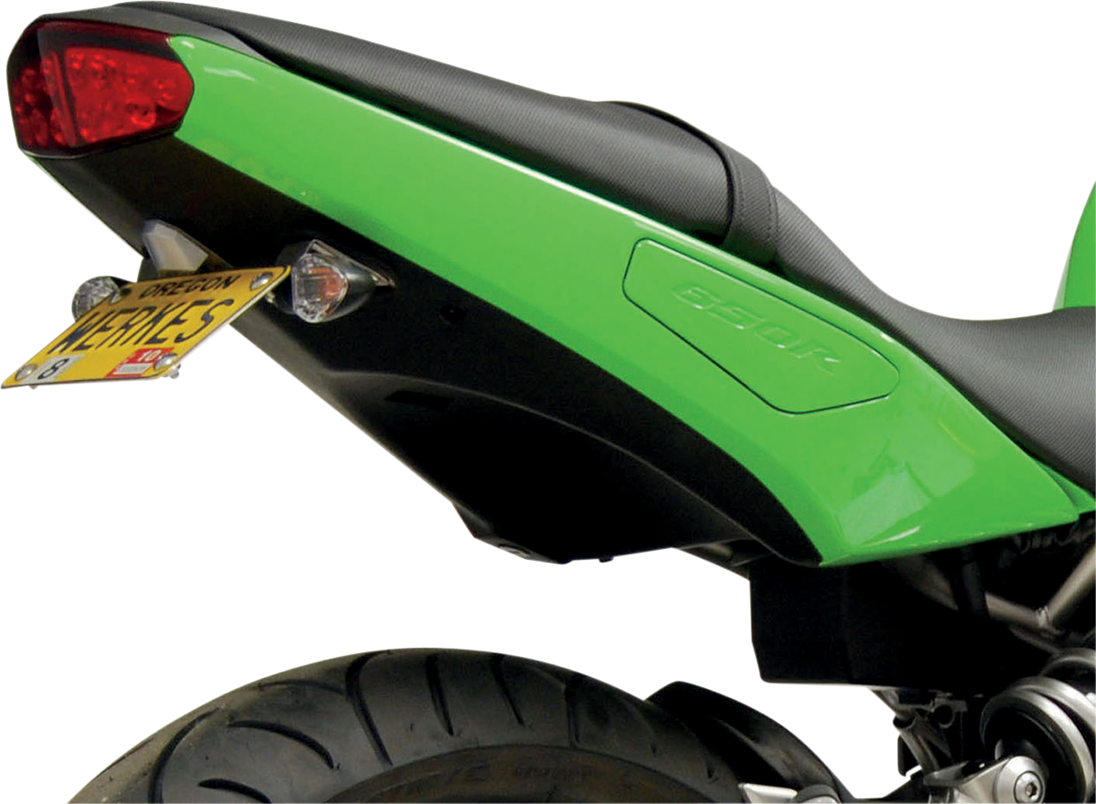 Fender Eliminator Kit - EX650R Fender Eliminator Kit with Turn Signals Eliminate the rear fender to give your bike a cleaner race-style look Made from CNC laser-cut 304 stainless steel Flush-mount rear LED turn signals and LED license plate light included Hardware and instructions for easy installation Made in the U.S.A. Fitment:
