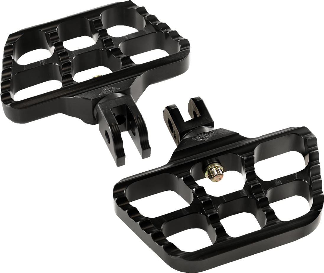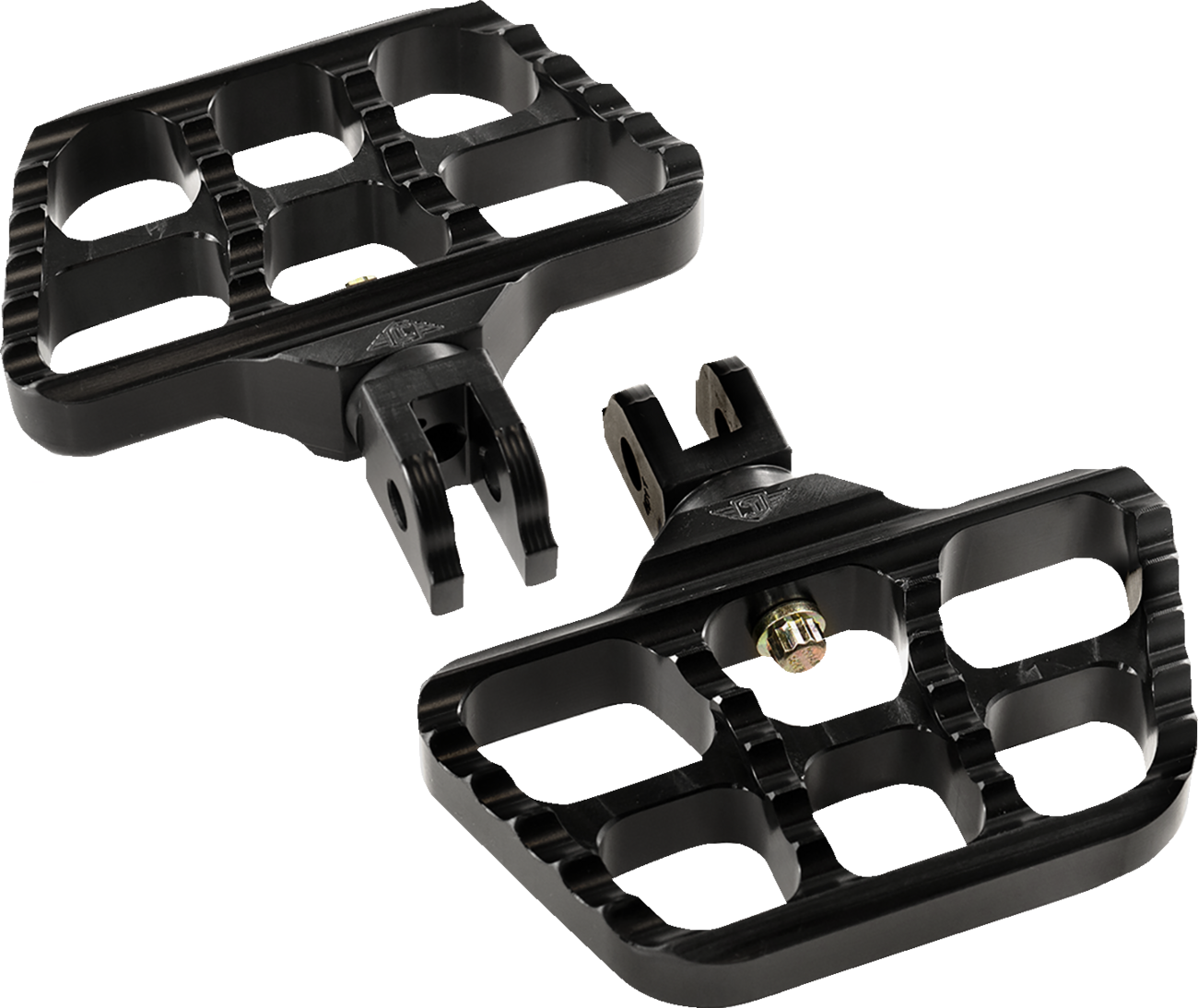 Mini Floorboards - Black - Softail Mini Serrated Floorboards CNC-machined from 6061 billet aluminum Strong, yet lightweight 2-piece construction Serrated for exceptional grip 360-degree foot peg adjustment Pitch adjustment screw for a level riding position Easy installation Made in the U.S.A. Fitment: