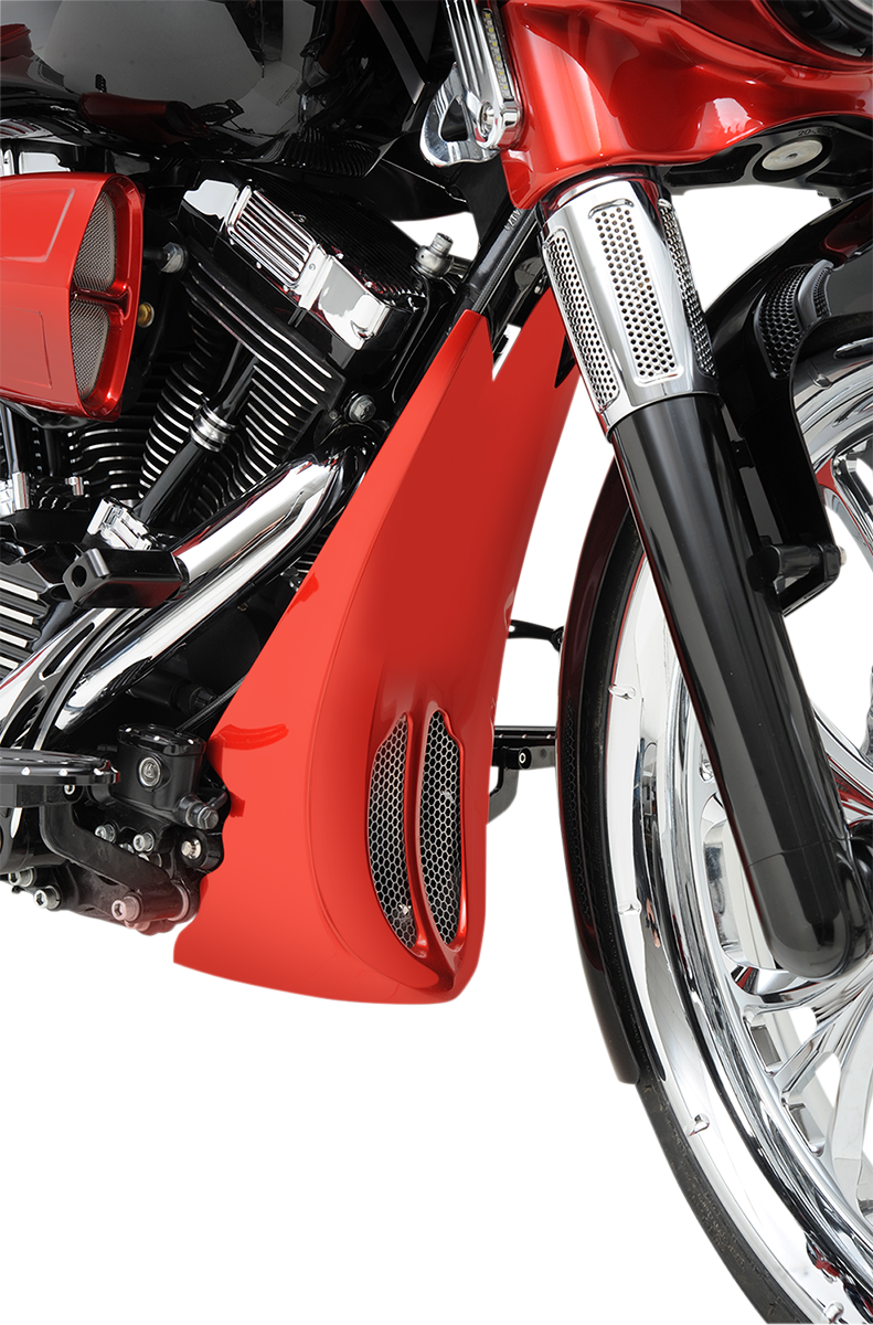 Frame Cover - Raked - FL Chin Spoiler Hand-laid fiberglass construction with a gel coat finish Help fill the gap between the wheel and the front of the frame to add a custom finishing touch to a Bagger Include all necessary hardware and grille insert Made in the U.S.A. Fitment: