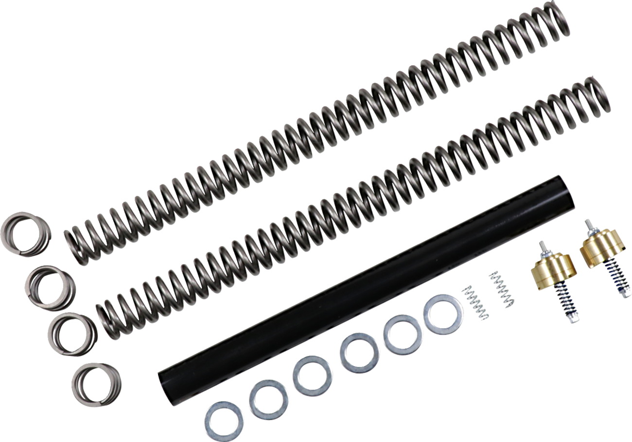 Complete Front End Suspension Kit - 0.90 kg/mm Spring Complete Front-End Suspension Kit Race Tech complete front-end suspension kits improve comfort and performance of damping rod forks Kits come with Race Tech Gold Valve cartridge fork emulators and high-performance springs Include hardware to lower bike 1” or 2” Fitment: