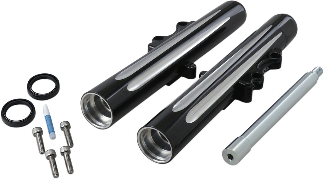 Hot Legs Fork Legs - Dual Disc - Deep Cut - Black - '00-'07 FLT Dual-Disc Hot Legs Fork Legs CNC machined from billet aluminum Features a tapered design with hidden axle Dual-disc for touring applications Accepts factory or aftermarket suspension internals Fitment: