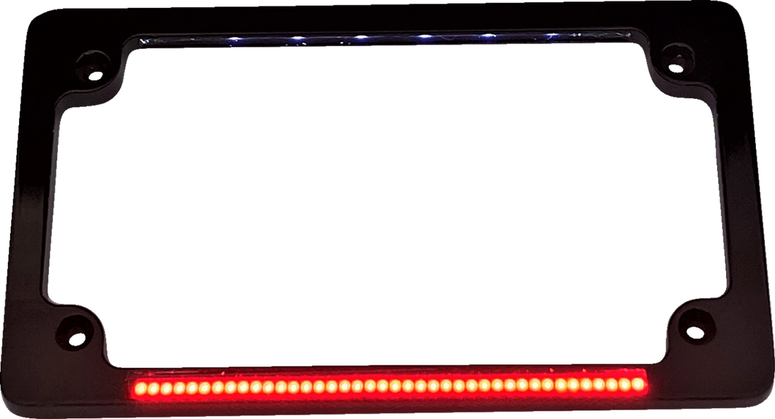 Dual License Plate Frame - Black Dual LED License Plate Frame Has six bright white license plate LEDs and 45 super-bright flush-mount dual-intensity red running/brake LEDs Plate dimensions measure: 7-1/4" L x 4-1/4" W Mounting hardware included