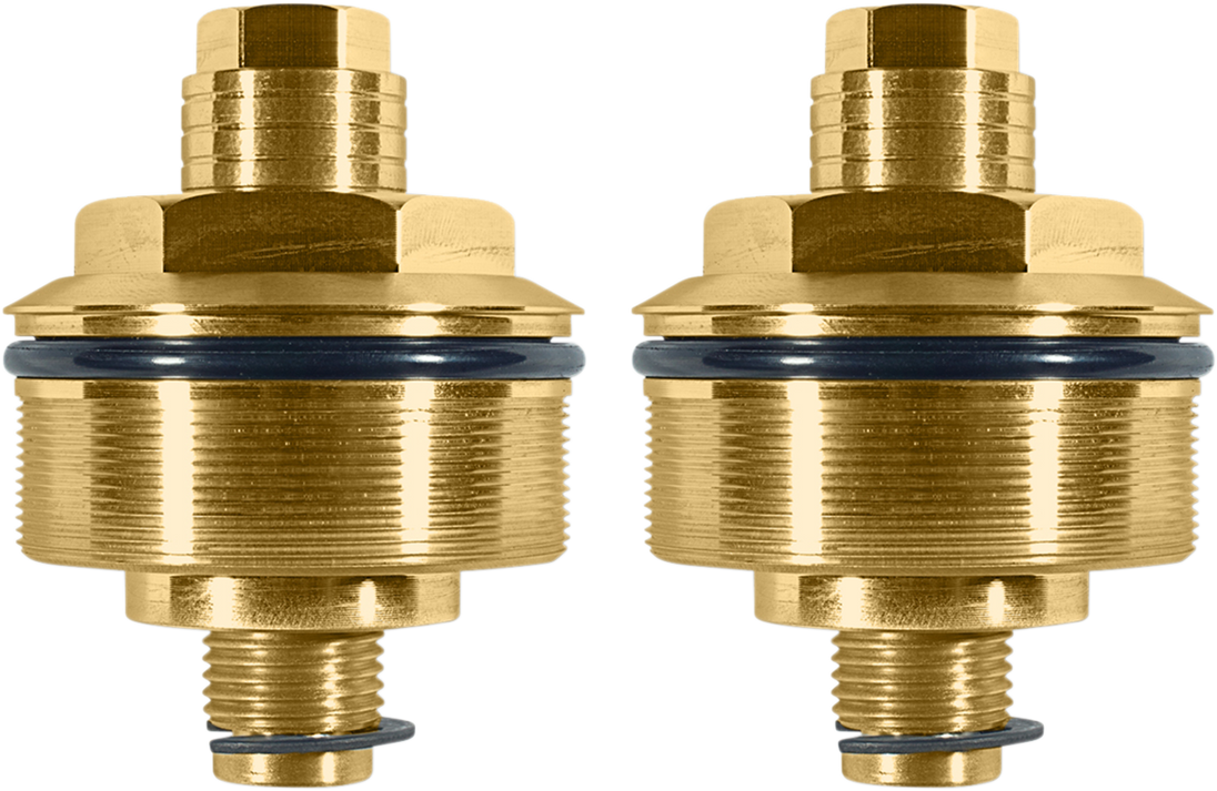 Fork Preload Adjuster - Gold Finish - 49 mm Fork Preload Adjusters These adjusters will replace your stock fork caps and allow you to fine tune your front suspension, with almost an inch of preload adjustment Easily dial in your front-end preload without having to remove the stock caps and cutting spacers, with a turn of the adjuster, up or down CNC machined out of 6061 aluminum Comes with O-rings and ready to install Made in the U.S.A. Fitment: