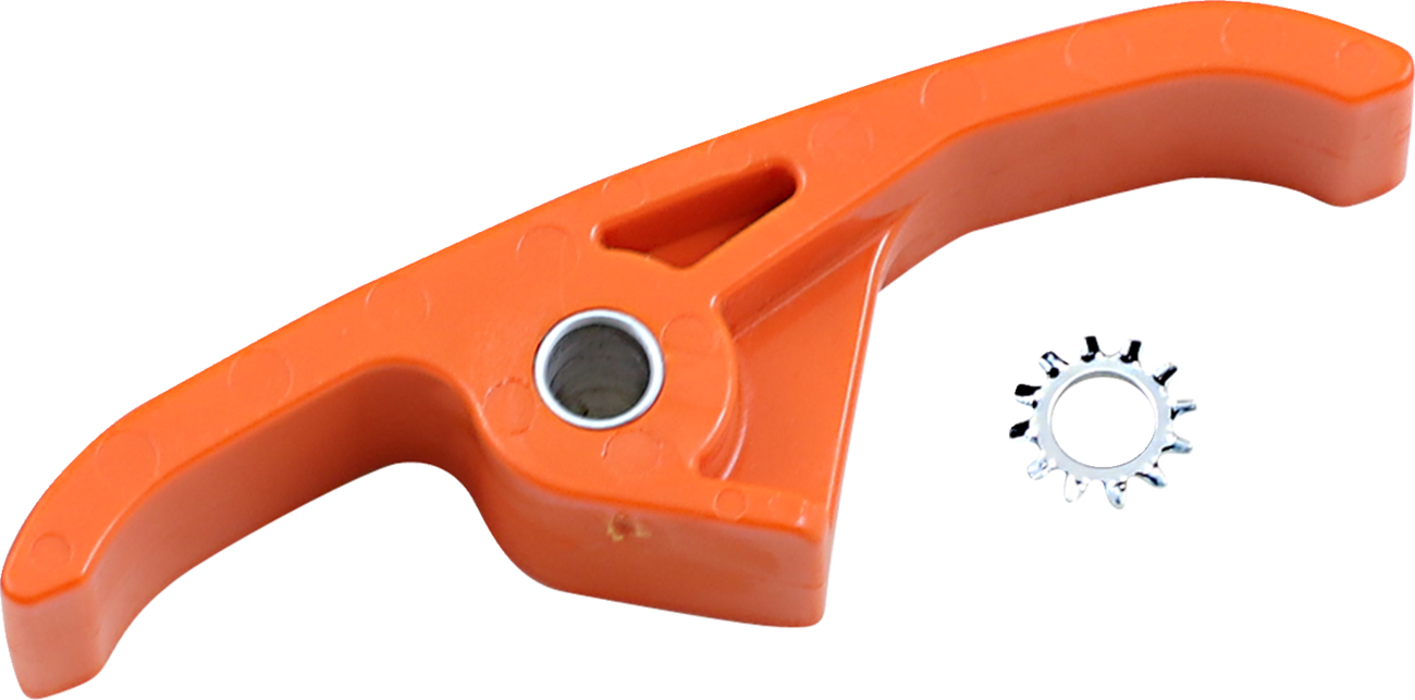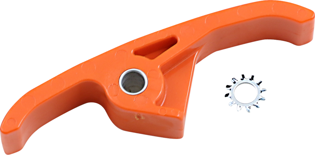 Frame Pad - KTM - Orange Frame Pad The lower frame pad has extended length to control the chain to rear wheel Special lower plastic pad that mounts under chain slider on the frame The stock part is made from high drag rubber with a flat surface Powerlip top increases speed and lowers chain plate drag The plastic is oil impregnated and UV protected Fitment: